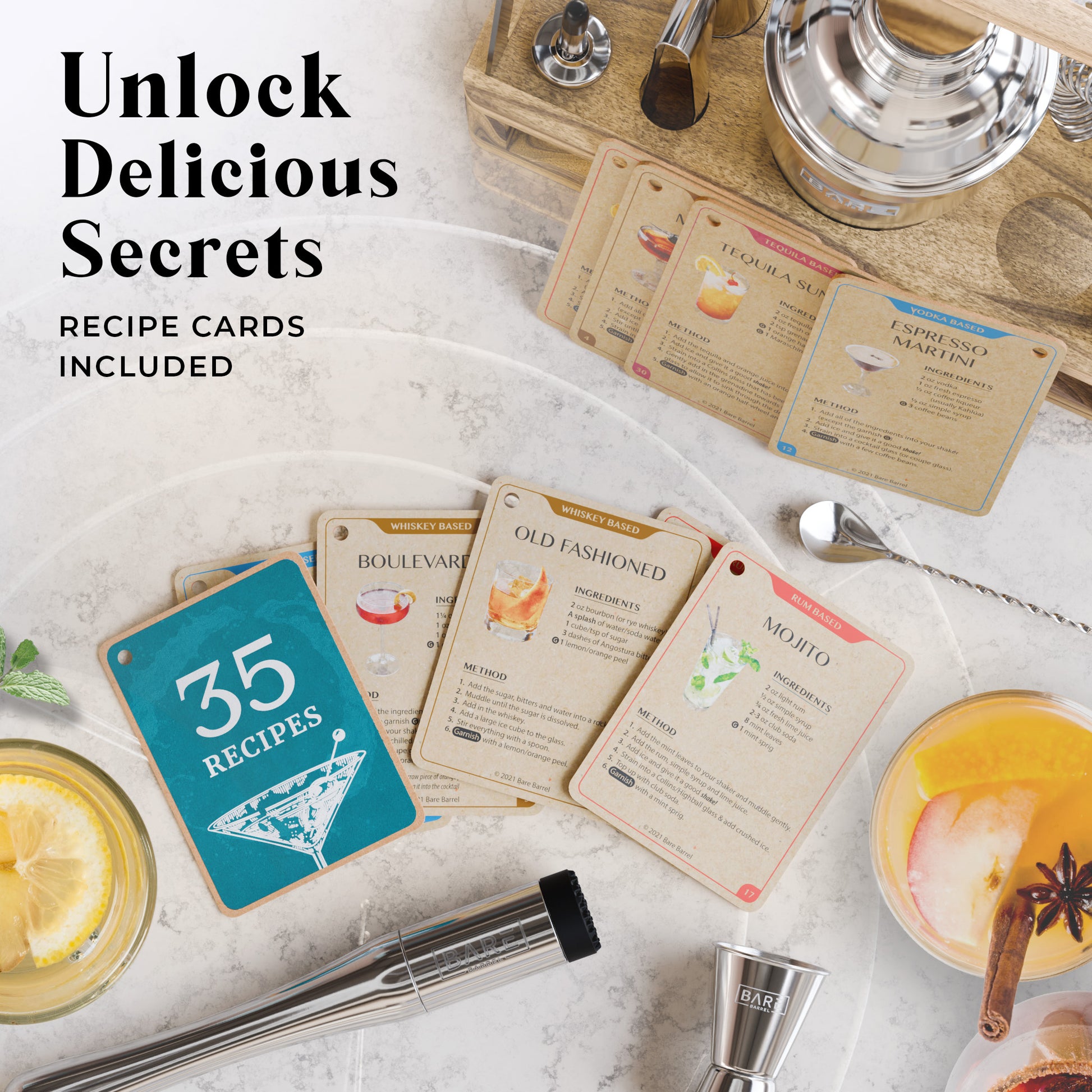 Bartending has never been this easy! Craft cocktails like a professional with Bare Barrel's easy-to-follow recipe cards so you can boast your mixology skills at your next party with our martini shaker set. -