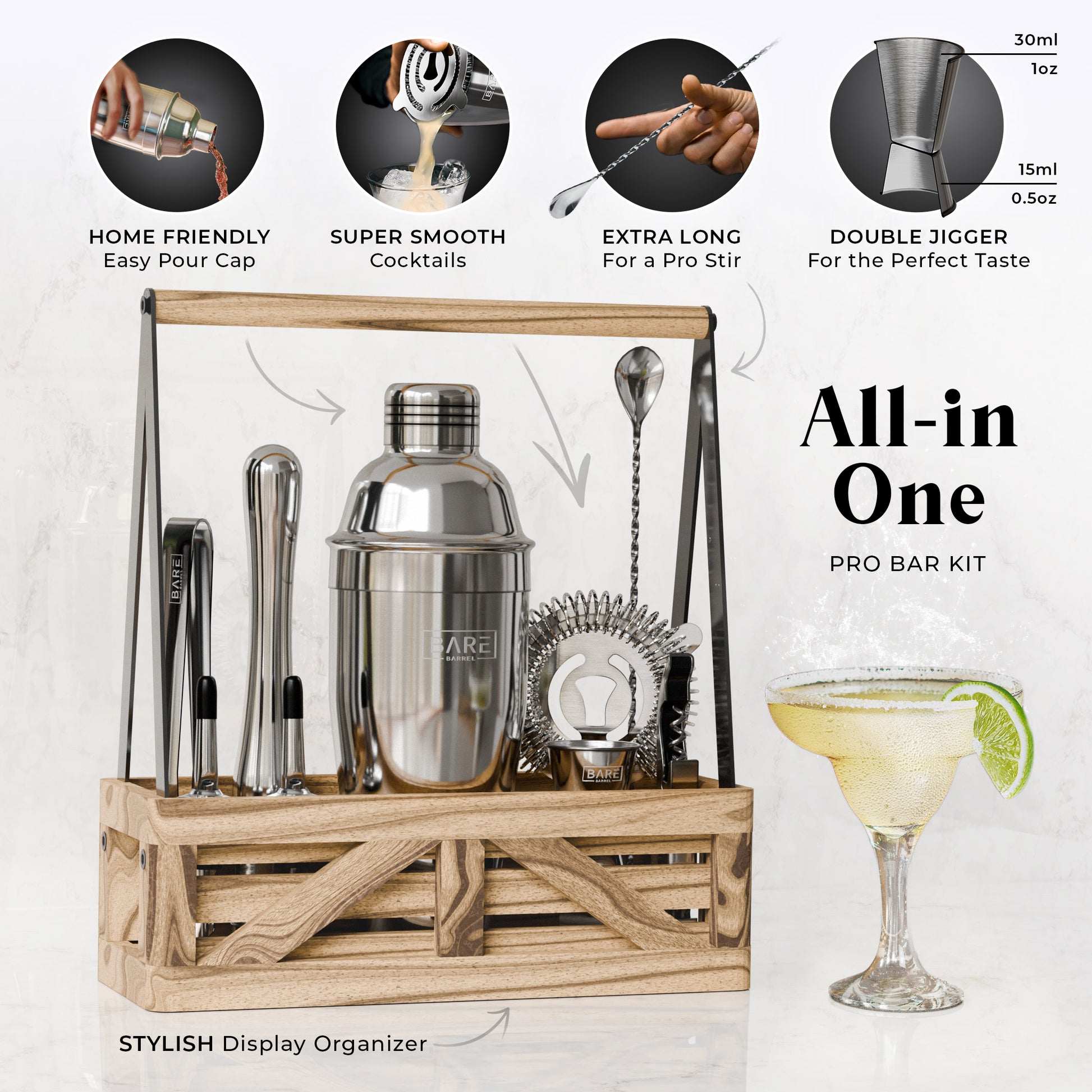 Bare Barrel's drink mixer set makes your aesthetic home bar unique and gets the job done! This mixology bartender kit is made of stainless steel that comes with a Patented muddler and display organizer stand.