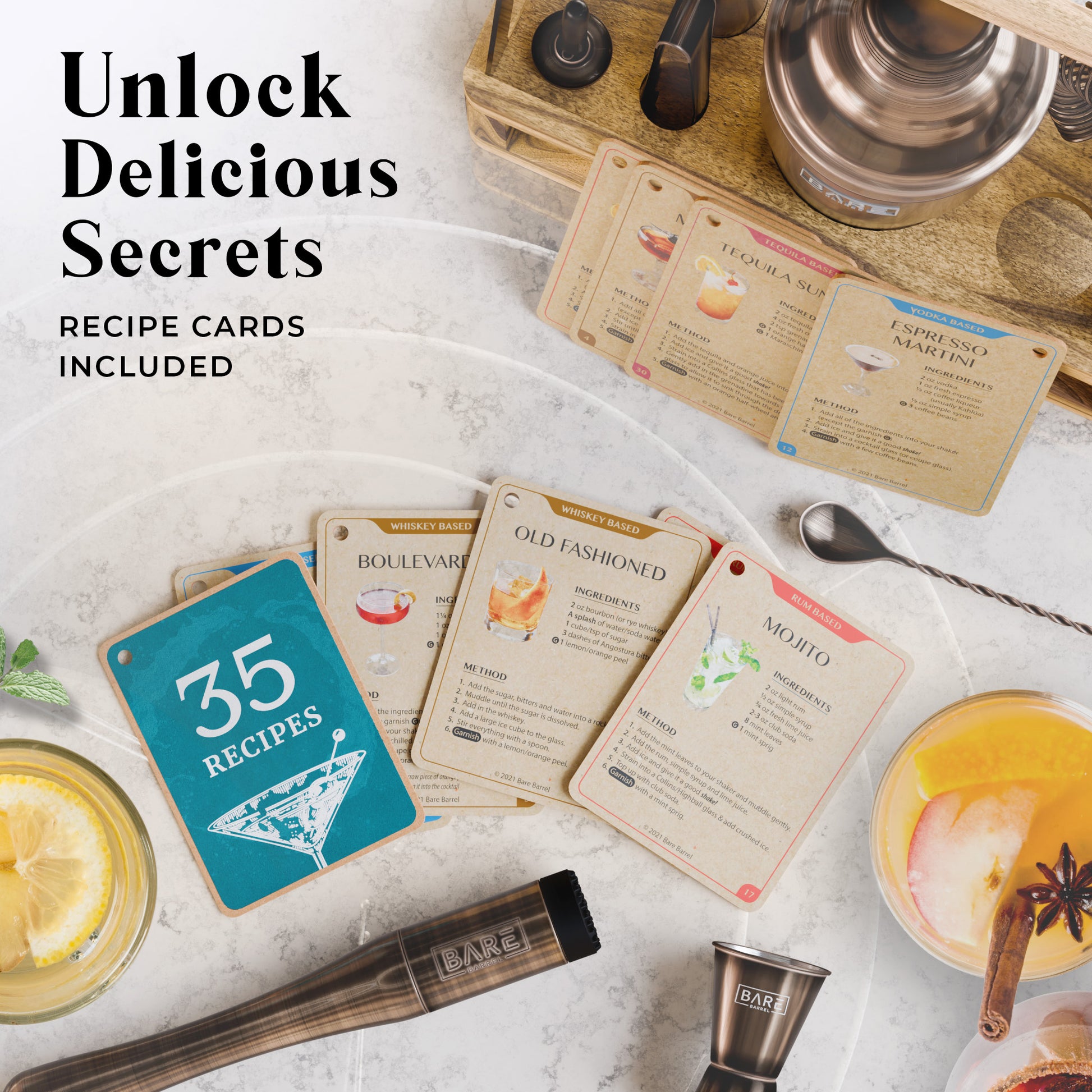 Thinking of a cool present for the aspiring mixologist in your life? With the design and functionality of our bartending kit, your friends and family would certainly enjoy using and showcasing your cocktail gift set. - 35 RECIPE CARDS FOR A FUN MIXING EXPERIENCE