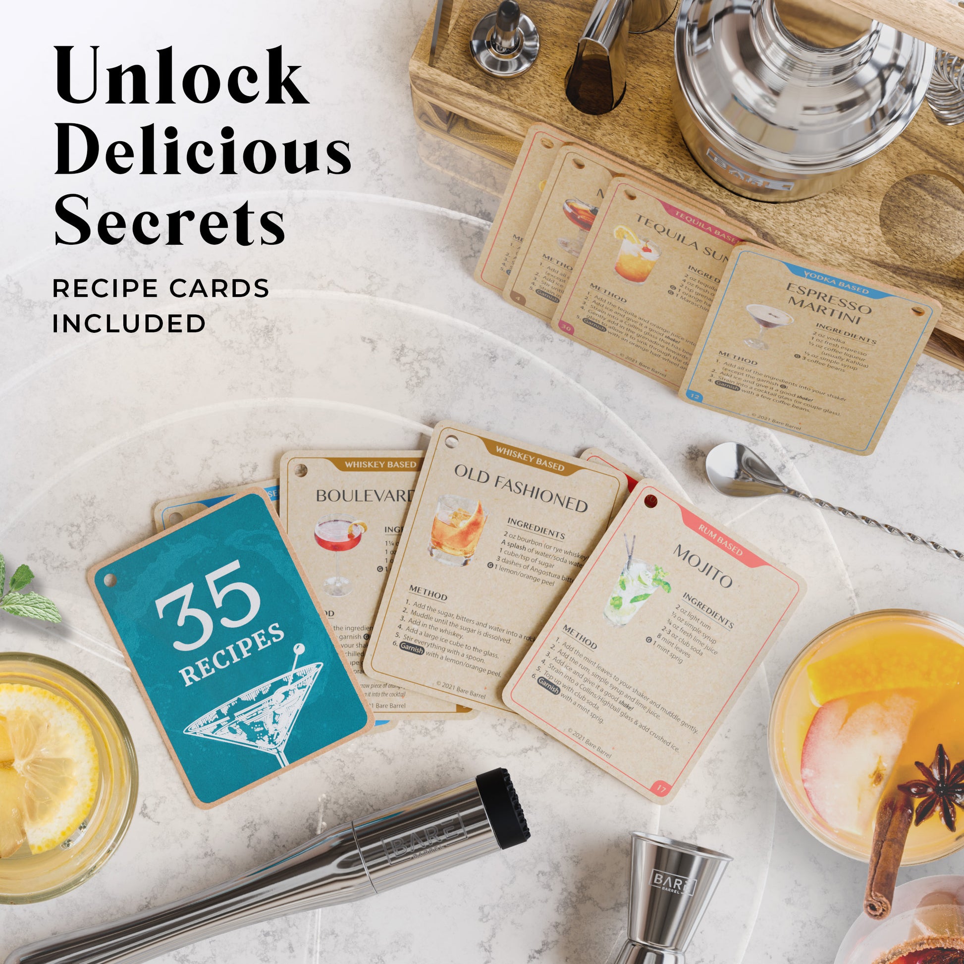 Bartending has never been this easy! Craft cocktails like a professional with Bare Barrel's easy-to-follow recipe cards so you can boast your mixology skills at your next party with our martini shaker set. -