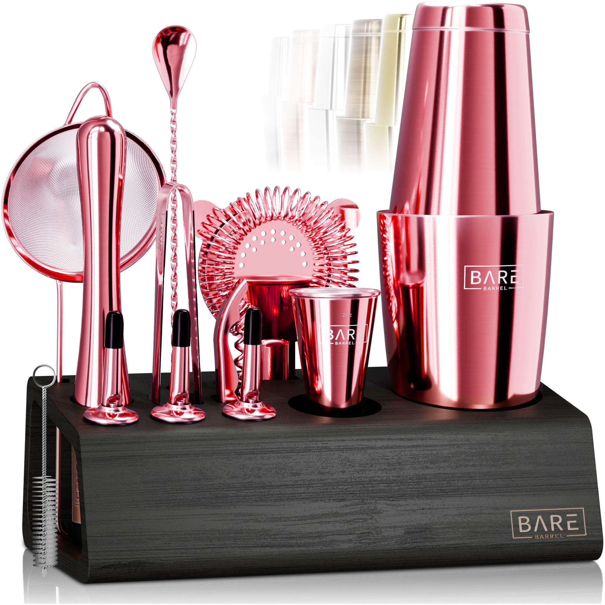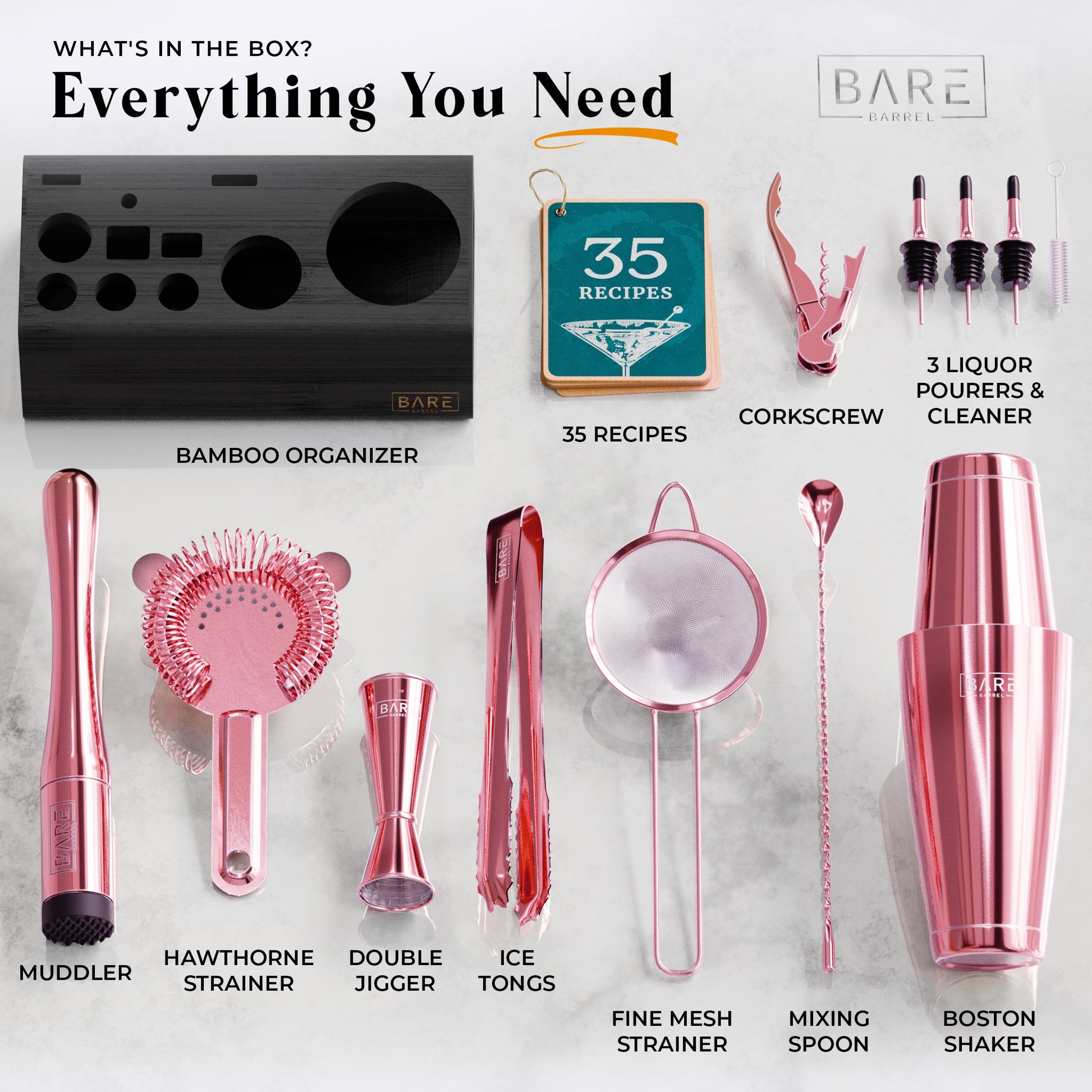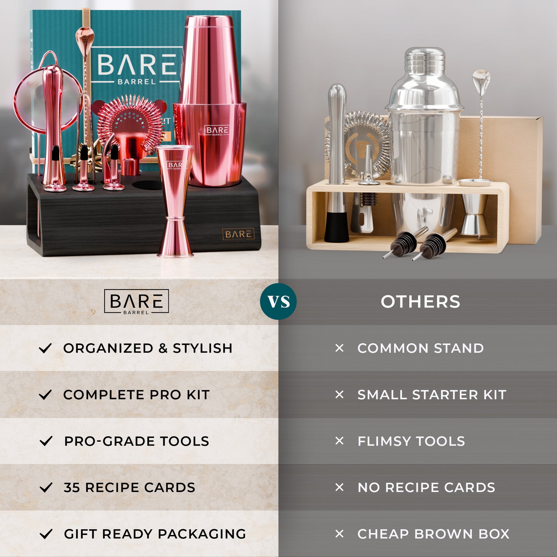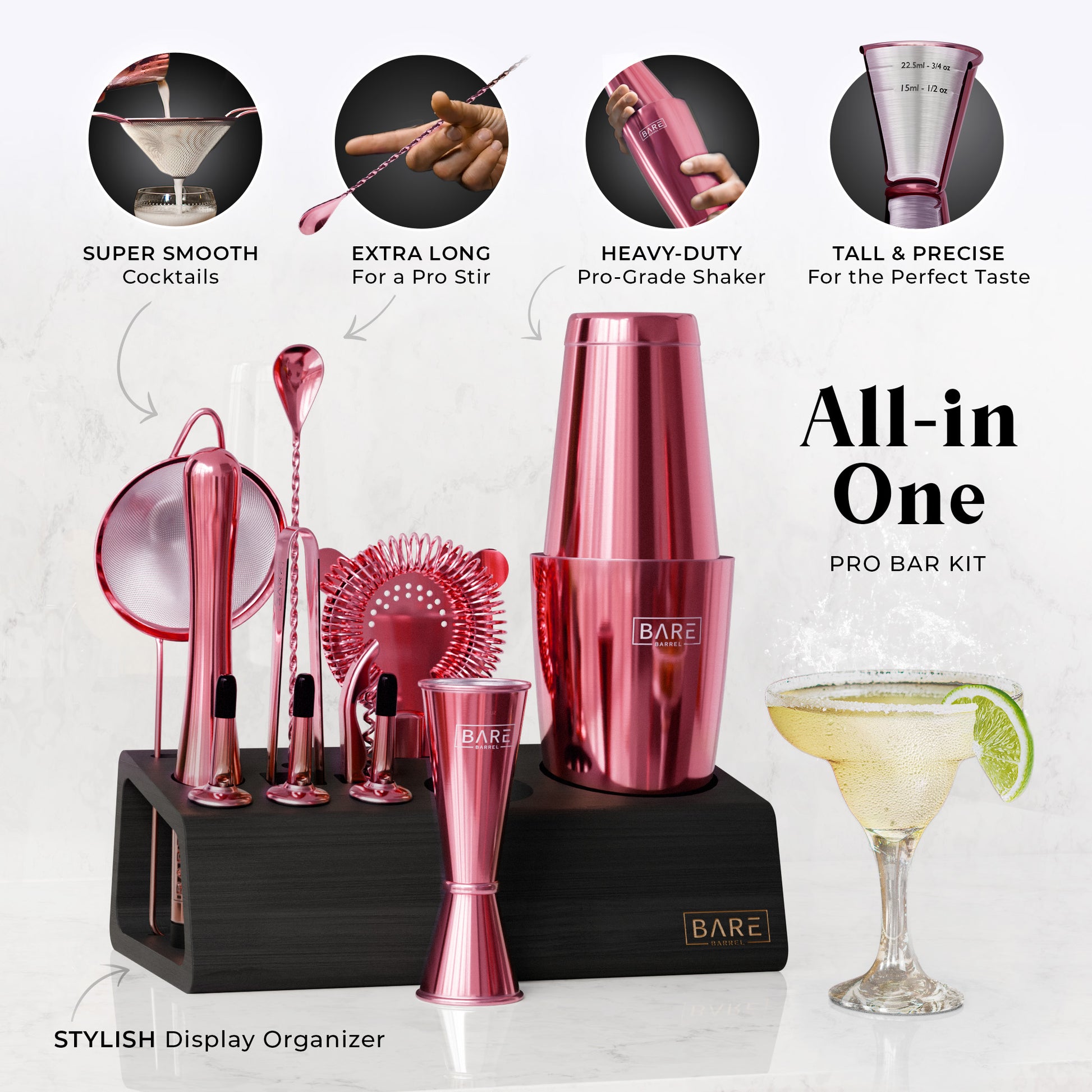 Bare Barrel's drink mixer set makes your aesthetic home bar unique and gets the job done! This mixology bartender kit is made of stainless steel that comes with a Patented muddler and display organizer stand.