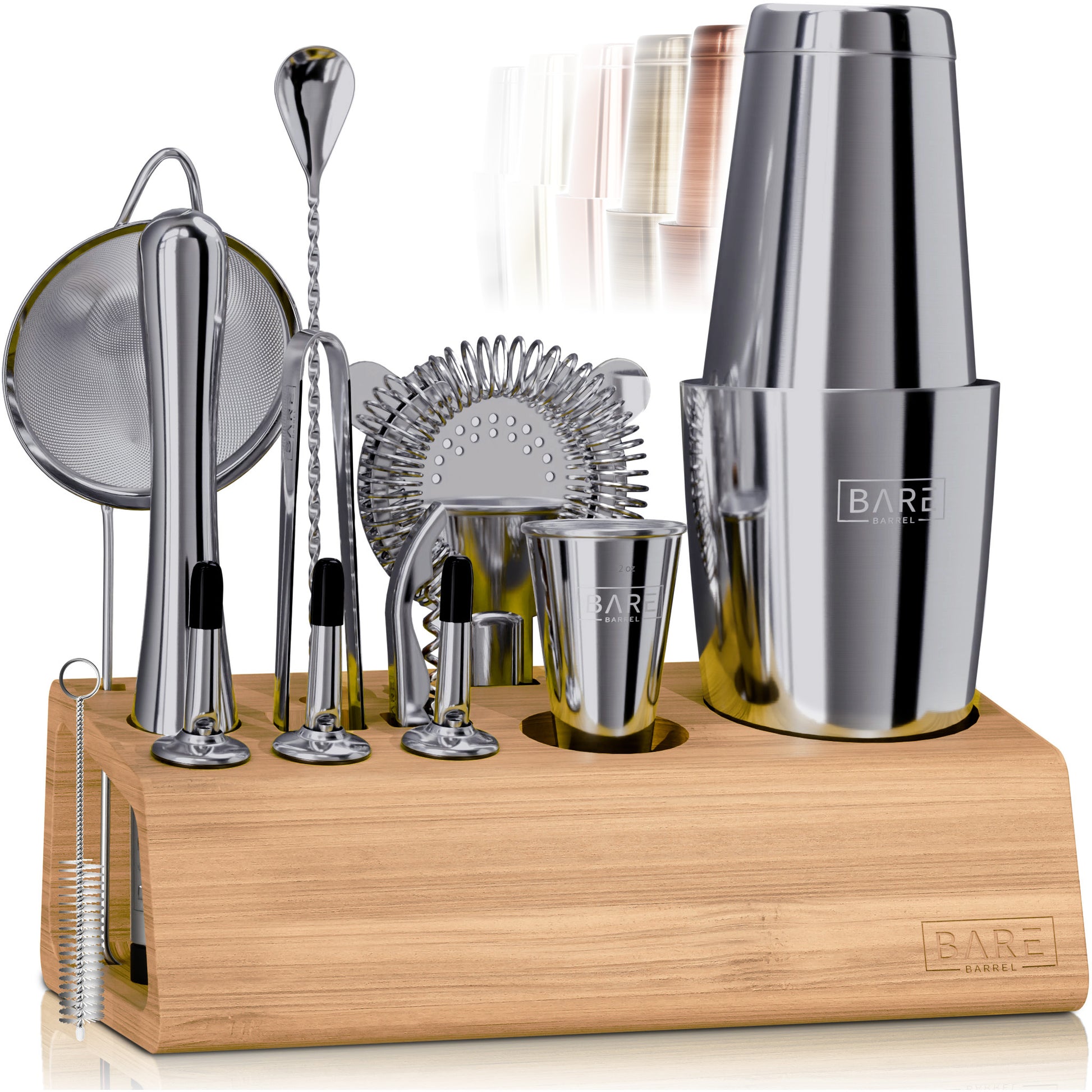 Bare Barrel's drink mixer set makes your aesthetic home bar unique and gets the job done! This mixology bartender kit is made of stainless steel that comes with a Patented muddler and display organizer stand.