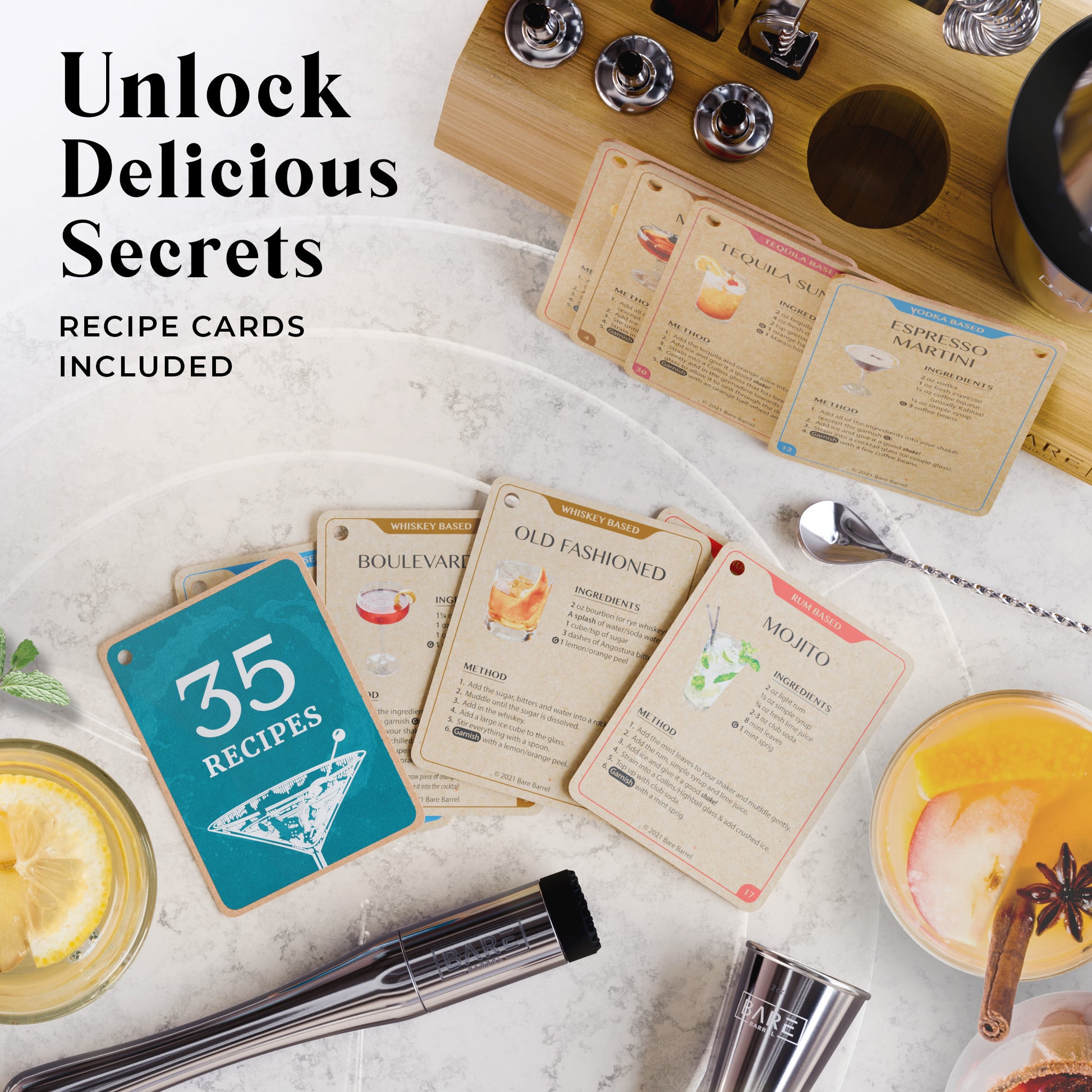 Thinking of a cool present for the aspiring mixologist in your life? With the design and functionality of our bartending kit, your friends and family would certainly enjoy using and showcasing your cocktail gift set. - 35 RECIPE CARDS FOR A FUN MIXING EXPERIENCE