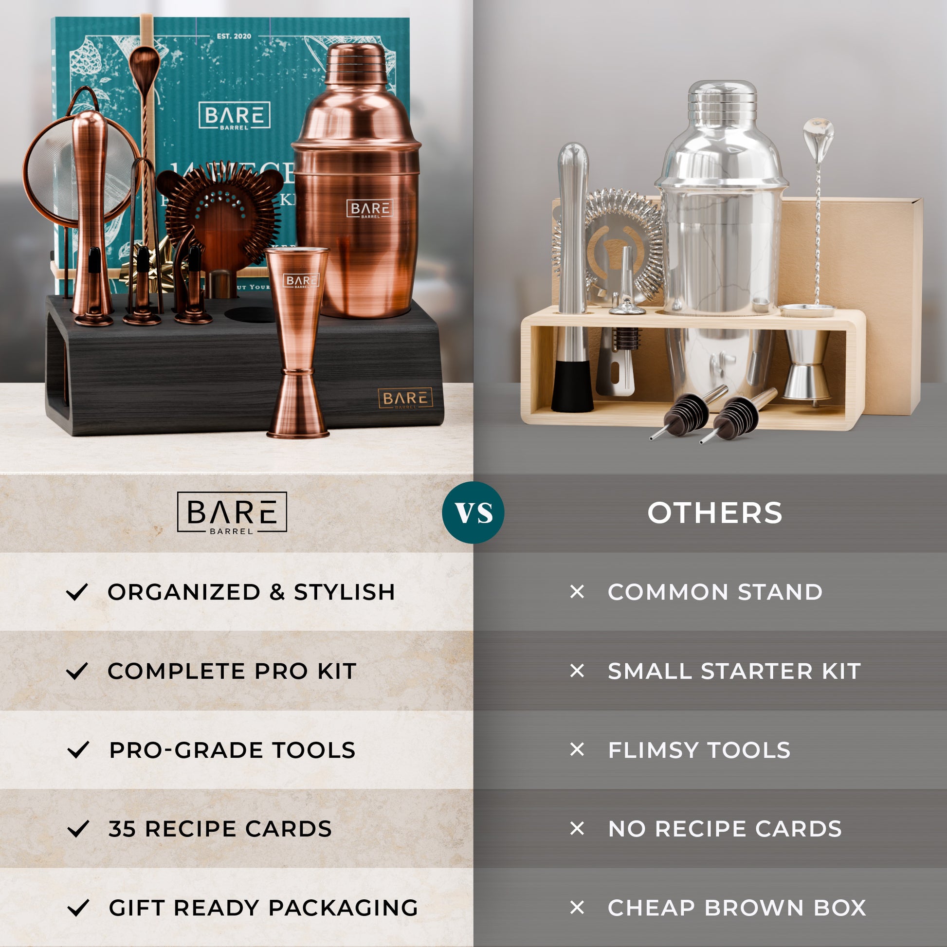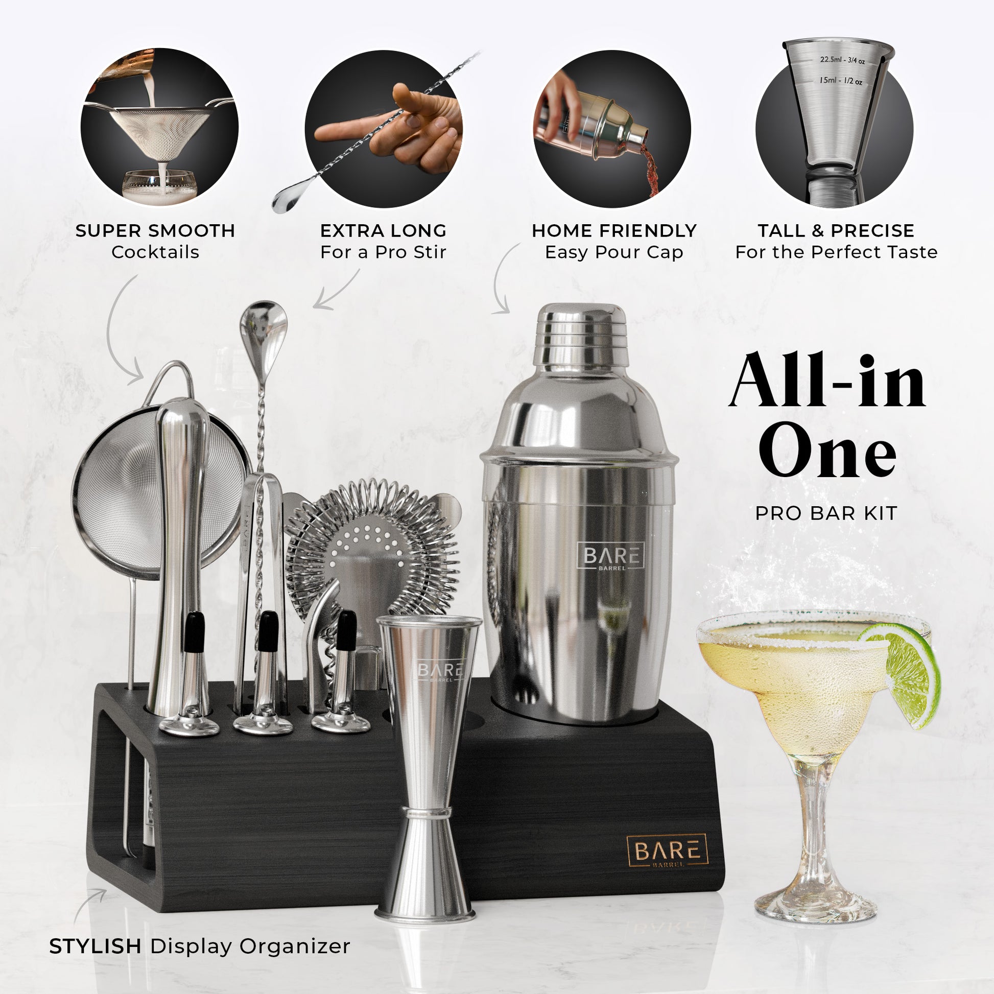 A complete bartending kit cocktail set with all the bar cart essentials equipment you need to shake & mix up delicious adult alcoholic drinks & mocktails.