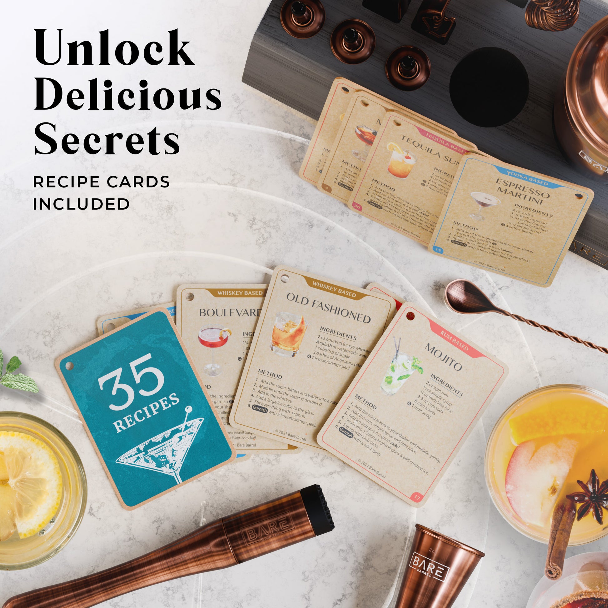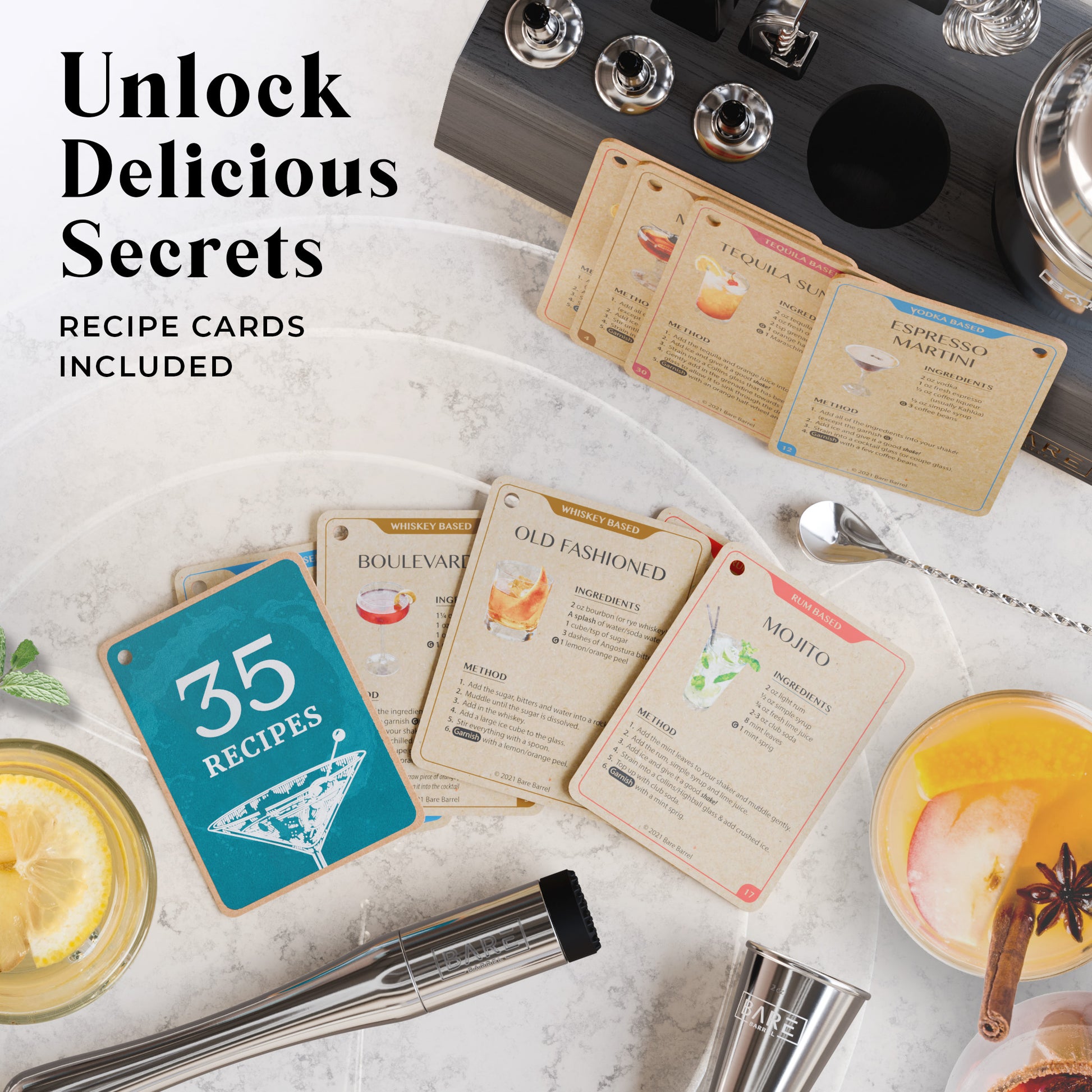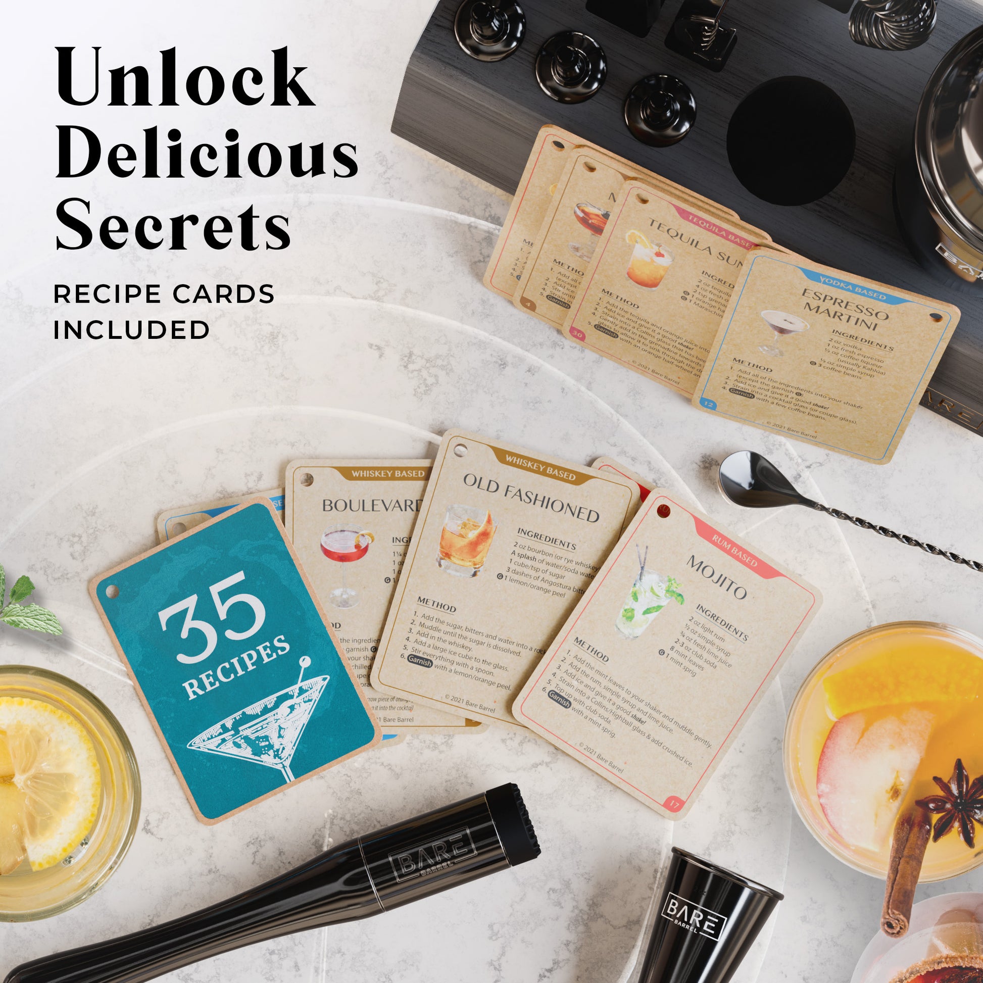 Includes 35 recipe cards, so whether you fancy the taste of whiskey, vodka, rum, gin or tequila, you're covered! Enjoy an Old Fashioned, Margarita, Martini, Mojito...