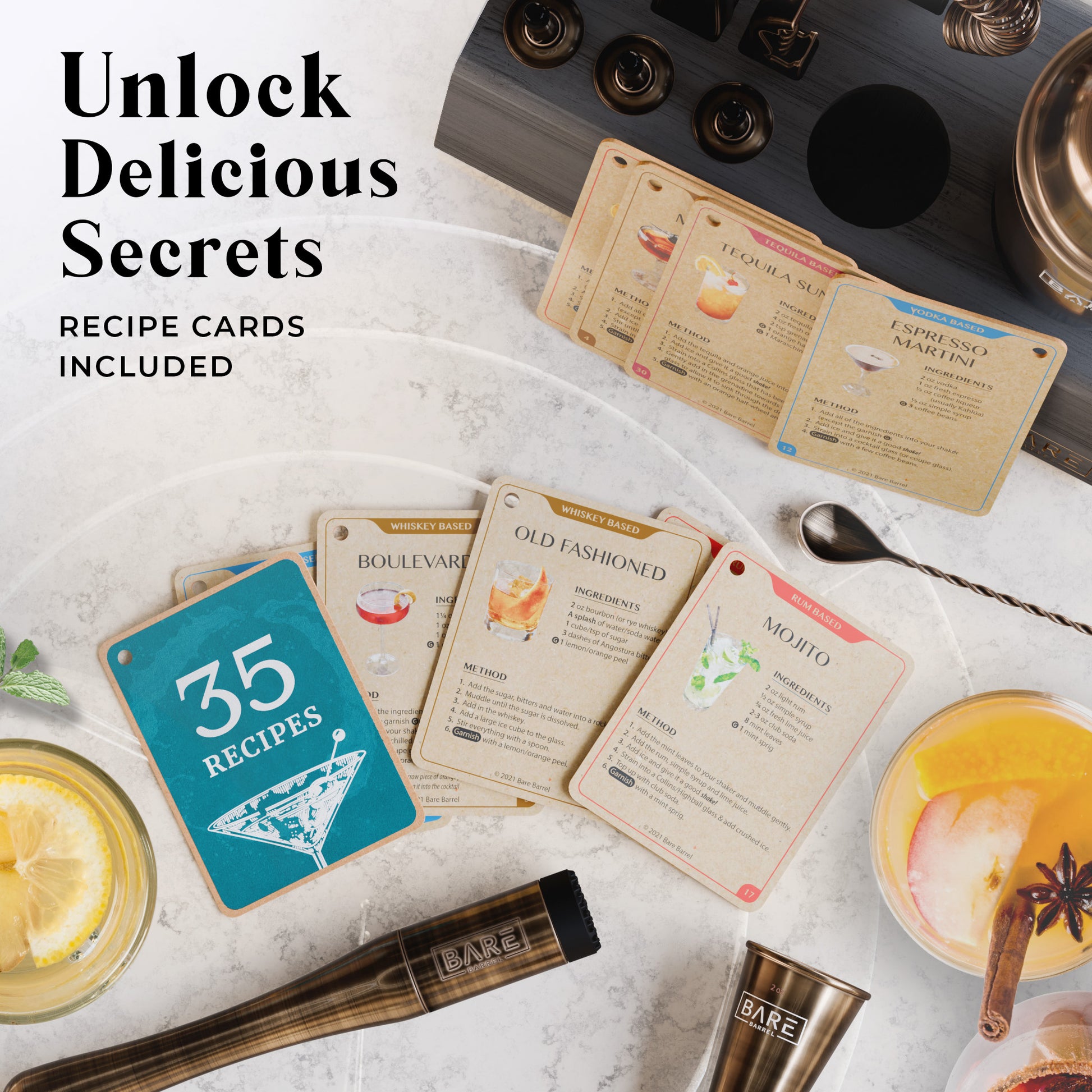 Bartending has never been this easy! Craft cocktails like a professional with Bare Barrel's easy-to-follow recipe cards so you can boast your mixology skills at your next party with our martini shaker set. -