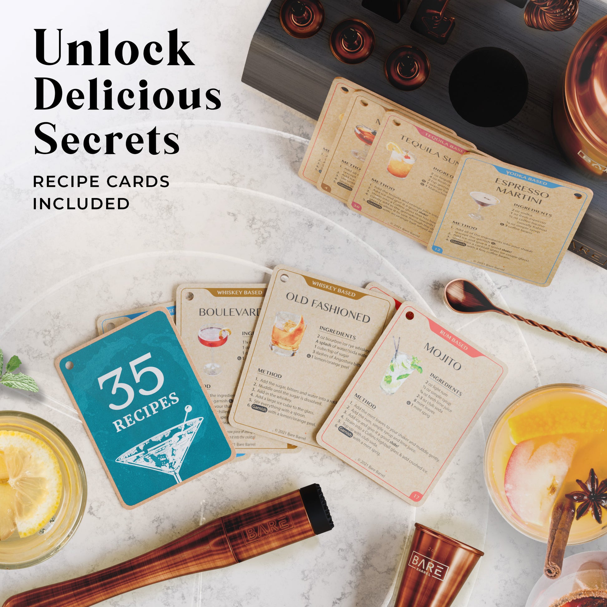 Thinking of a cool present for the aspiring mixologist in your life? With the design and functionality of our bartending kit, your friends and family would certainly enjoy using and showcasing your cocktail gift set. - 35 RECIPE CARDS FOR A FUN MIXING EXPERIENCE