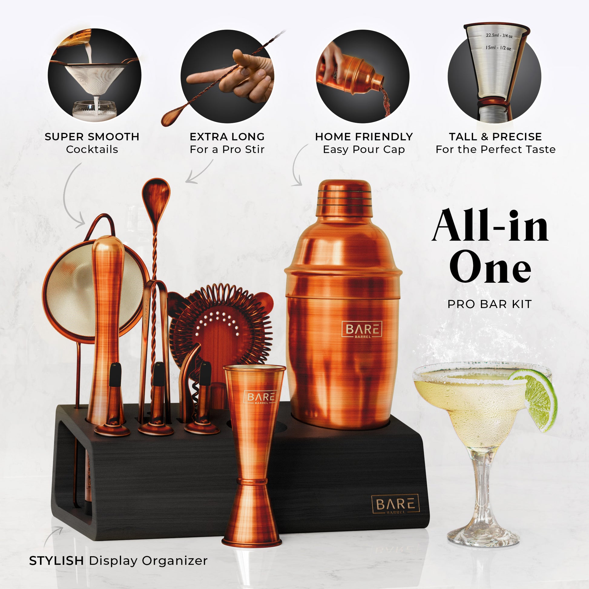 Bare Barrel's drink mixer set makes your aesthetic home bar unique and gets the job done! This mixology bartender kit is made of stainless steel that comes with a Patented muddler and display organizer stand.