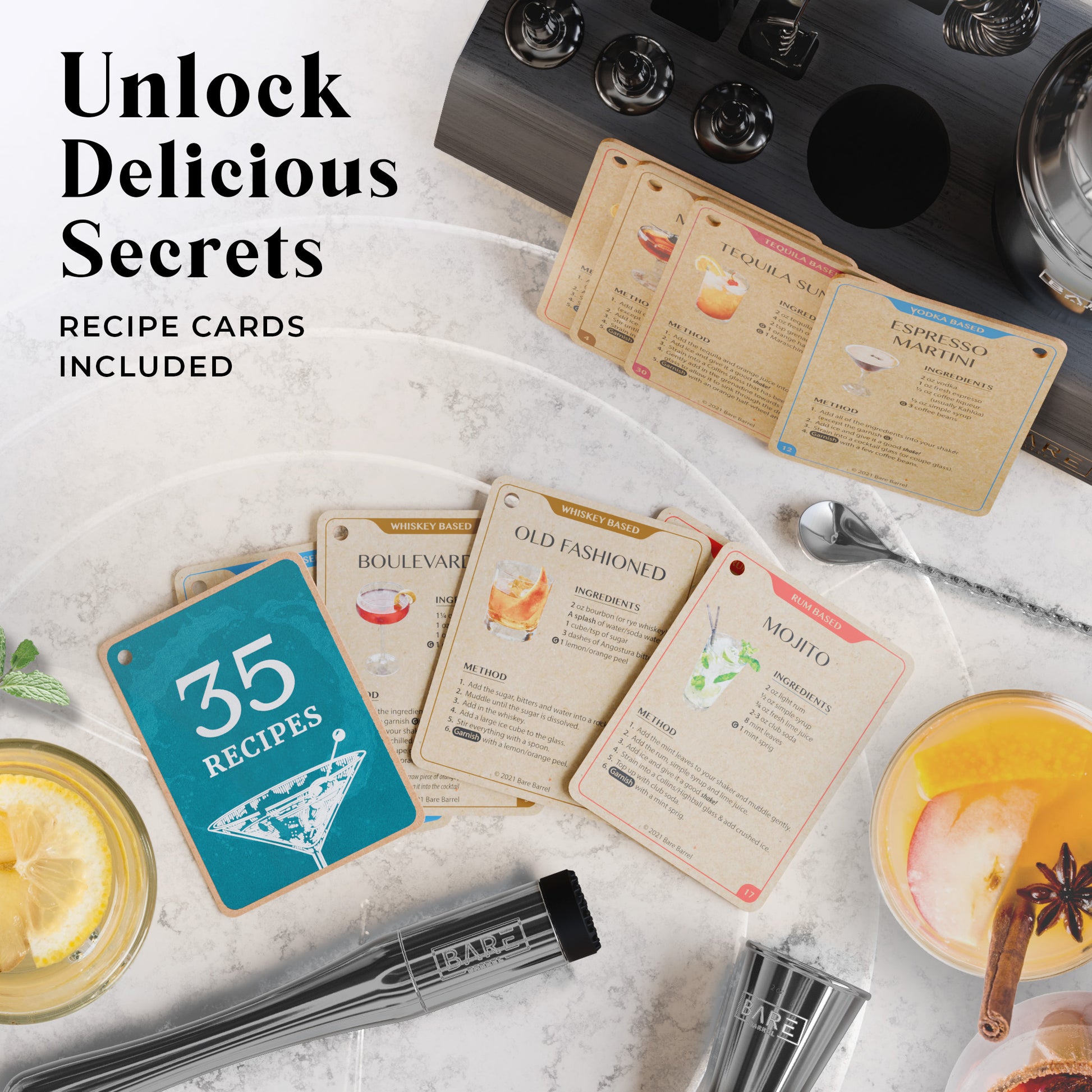 Thinking of a cool present for the aspiring mixologist in your life? With the design and functionality of our bartending kit, your friends and family would certainly enjoy using and showcasing your cocktail gift set. - 35 RECIPE CARDS FOR A FUN MIXING EXPERIENCE