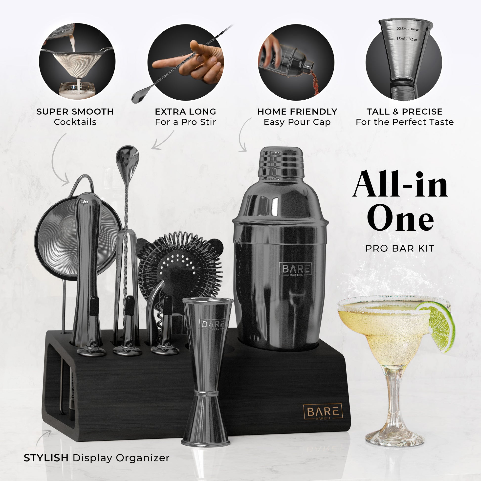 Bare Barrel's drink mixer set makes your aesthetic home bar unique and gets the job done! This mixology bartender kit is made of stainless steel that comes with a Patented muddler and display organizer stand.