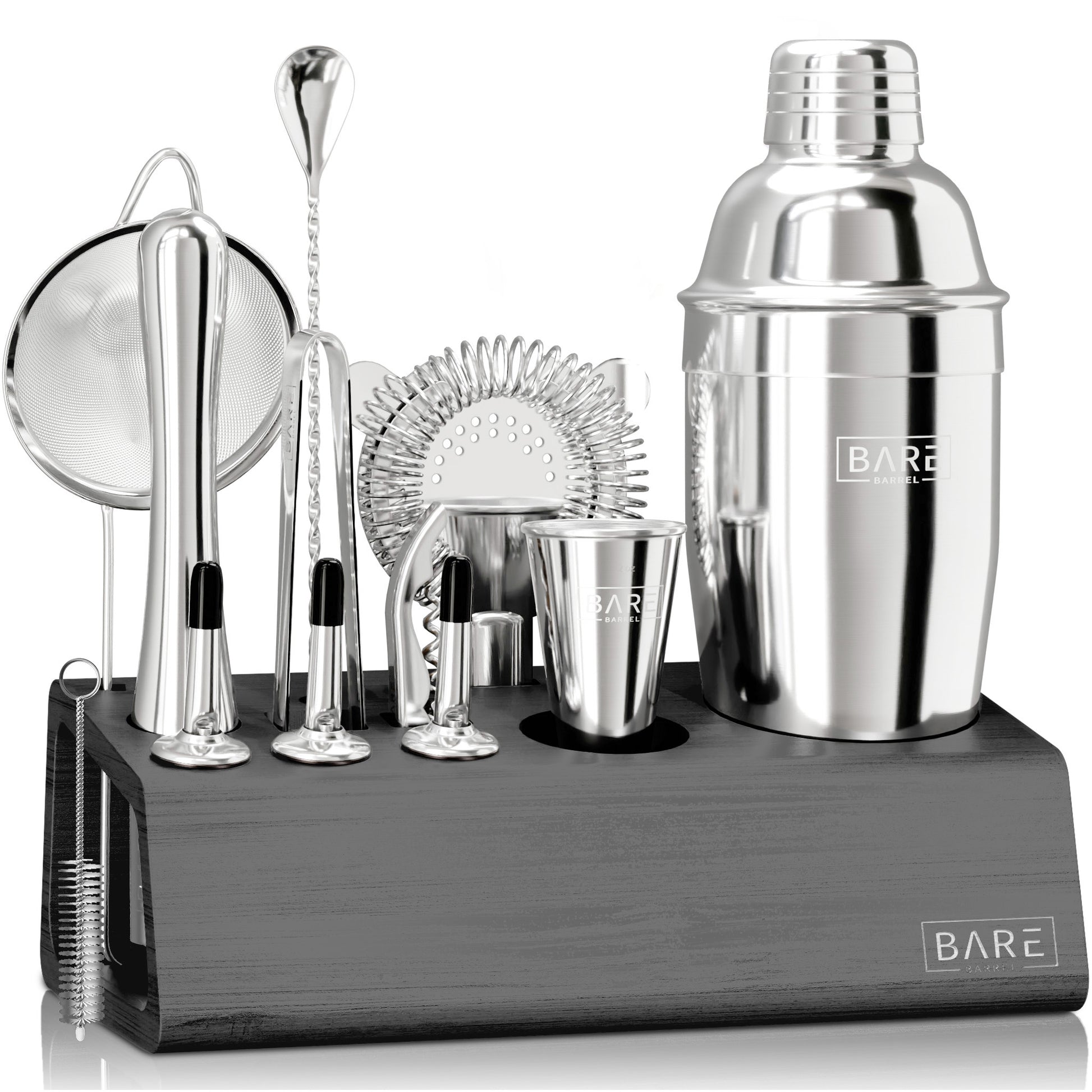 Bare Barrel's drink mixer set makes your aesthetic home bar unique and gets the job done! This mixology bartender kit is made of stainless steel that comes with a Patented muddler and display organizer stand.