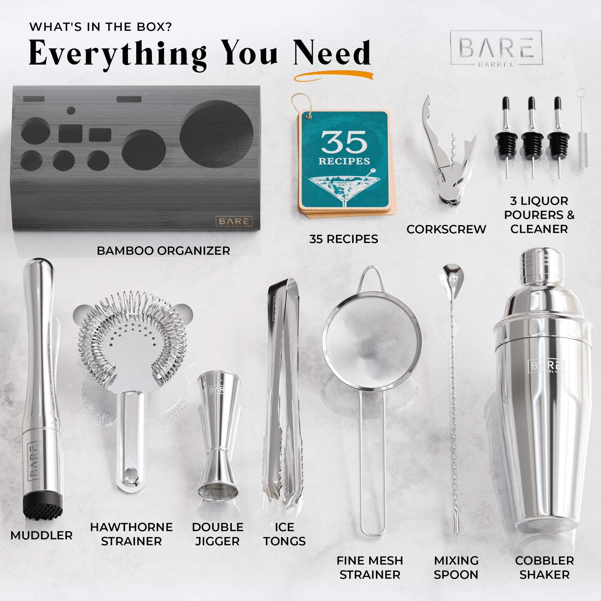 Thanks to Bare Barrel's 14-piece bar sets for the home, you get a headstart on your alcohol mixing journey. Our cocktail set includes all bar cart essentials for making drinks for your guests! - A GIFT SET ANYBODY WOULD LOVE