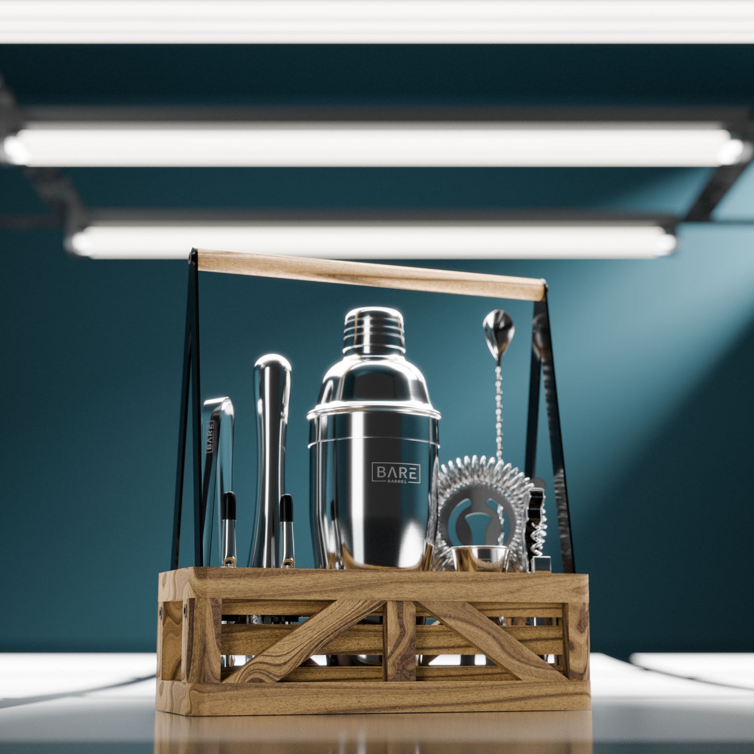 A rustic bar kit features essential tools housed in a charming wooden stand with earthy tones, evoking warmth, durability, and vintage-inspired craftsmanship.