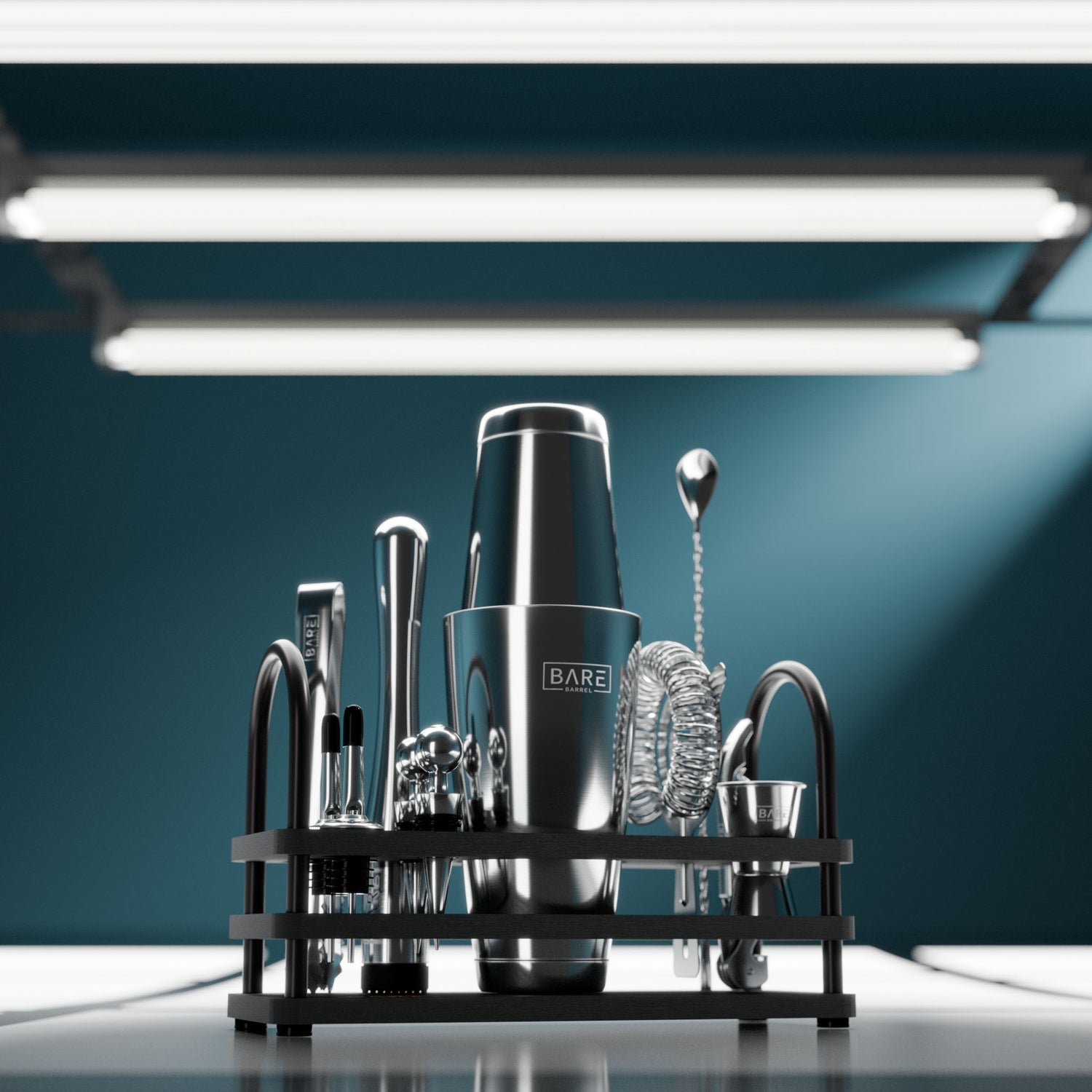 A complete bar kit includes essential tools for mixing and serving drinks, elegantly organized in a durable, stylish stand.