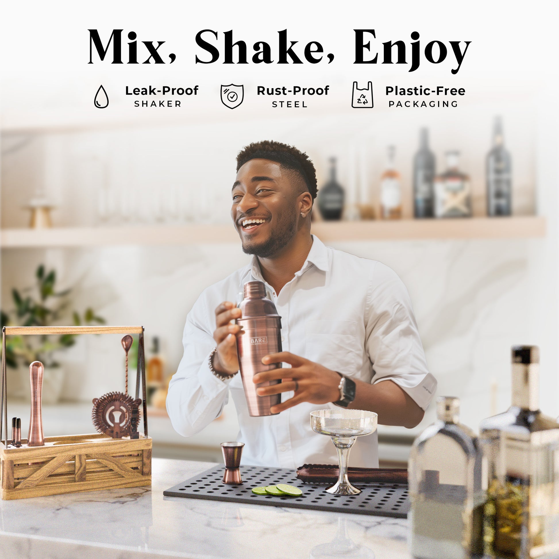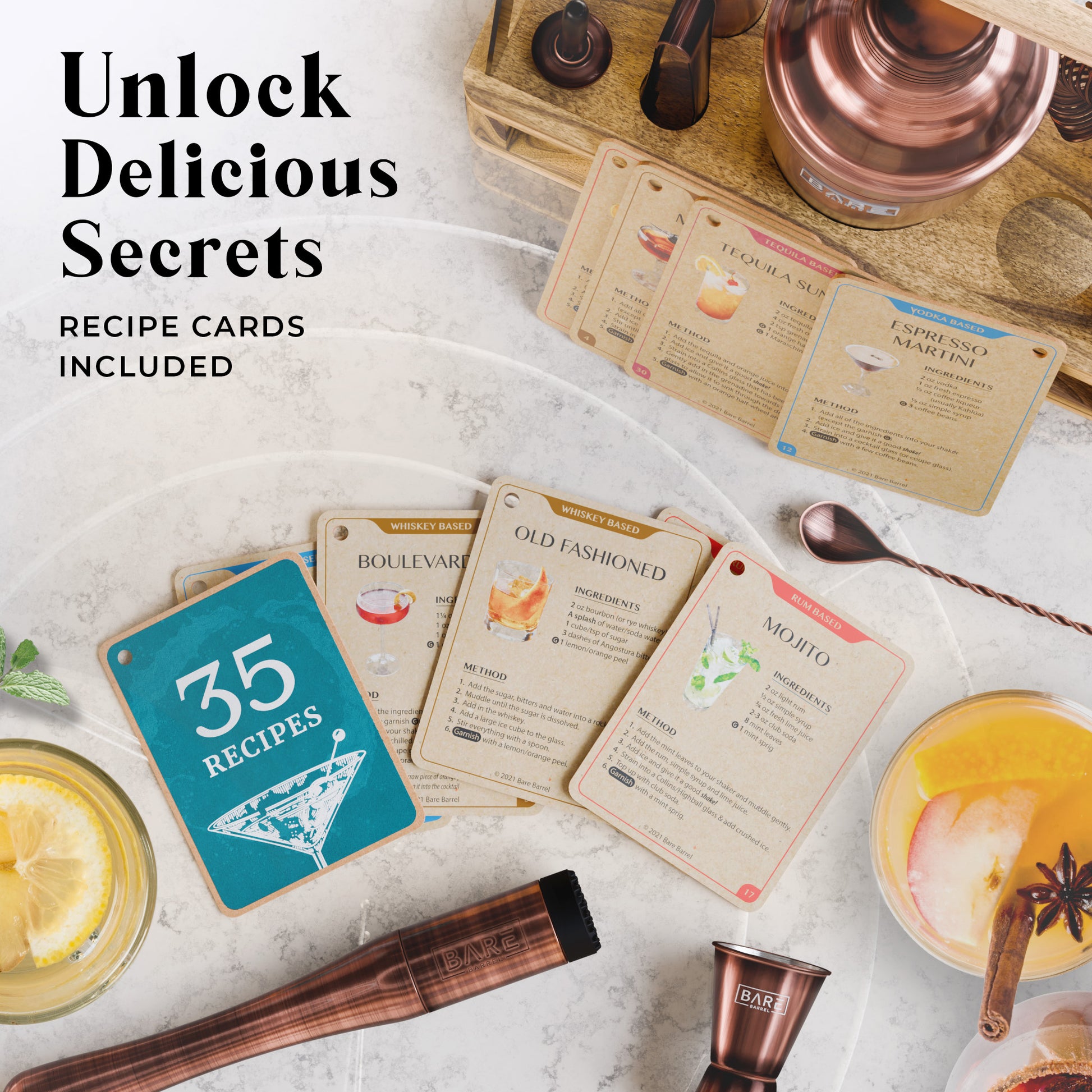 Bartending has never been this easy! Craft cocktails like a professional with Bare Barrel's easy-to-follow recipe cards so you can boast your mixology skills at your next party with our martini shaker set. -