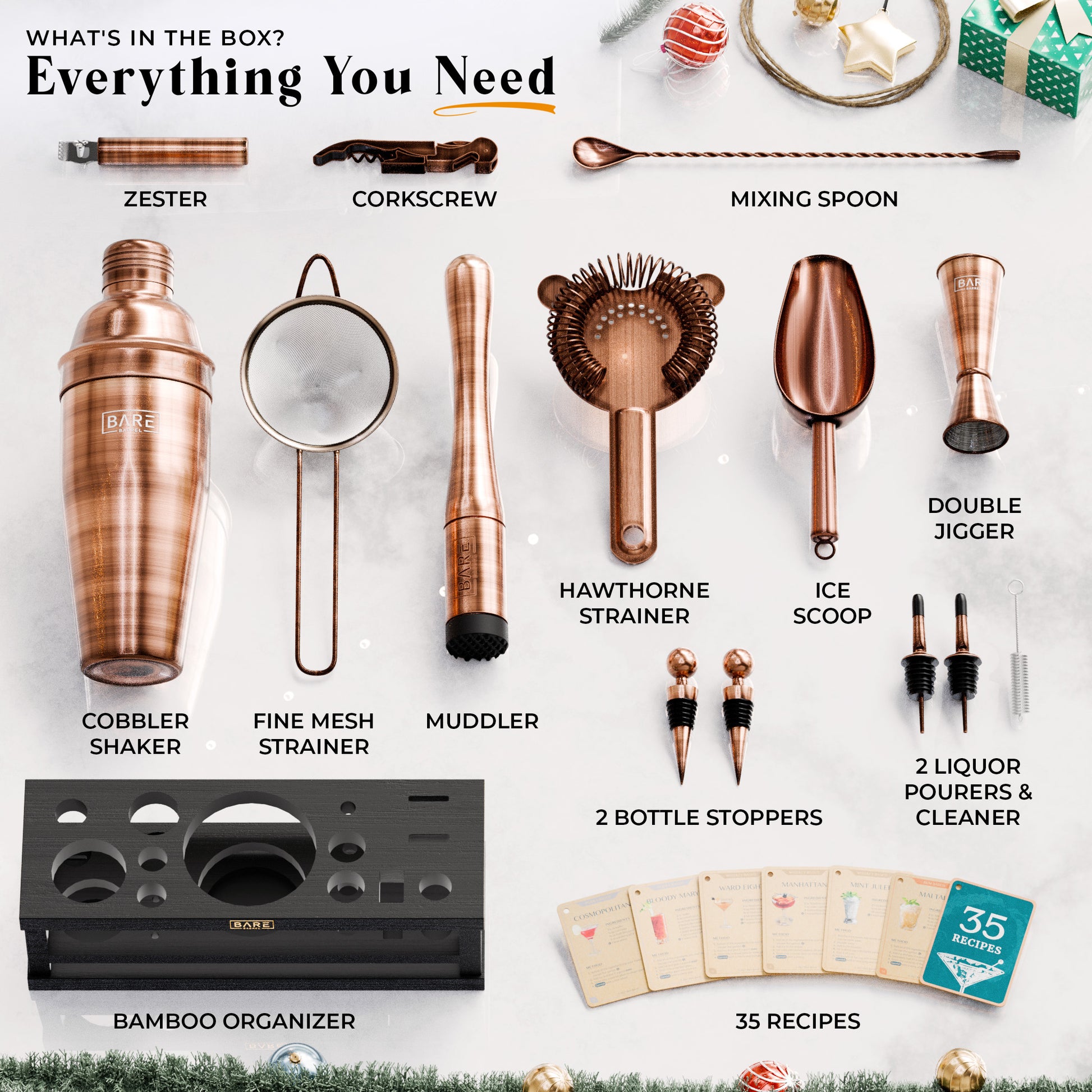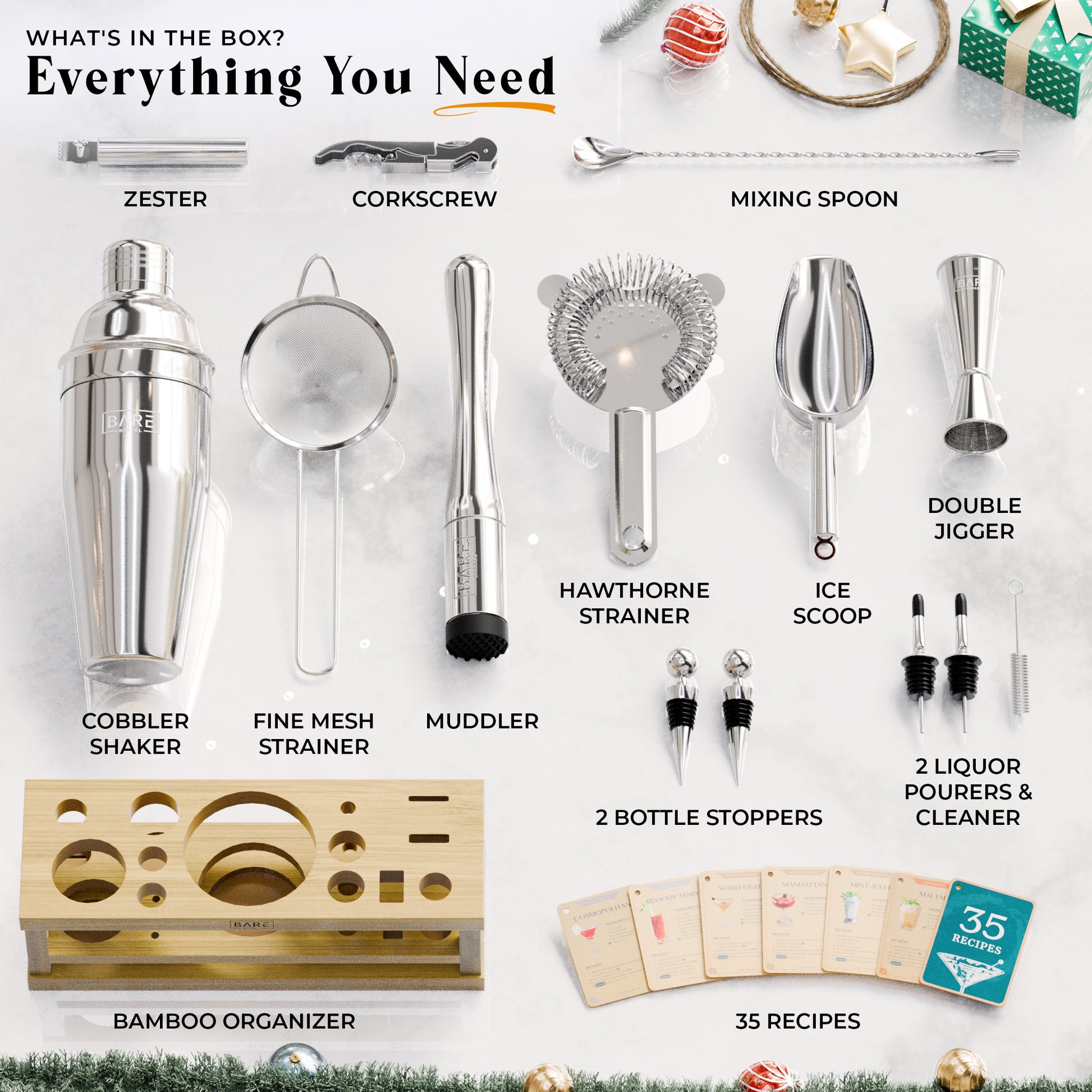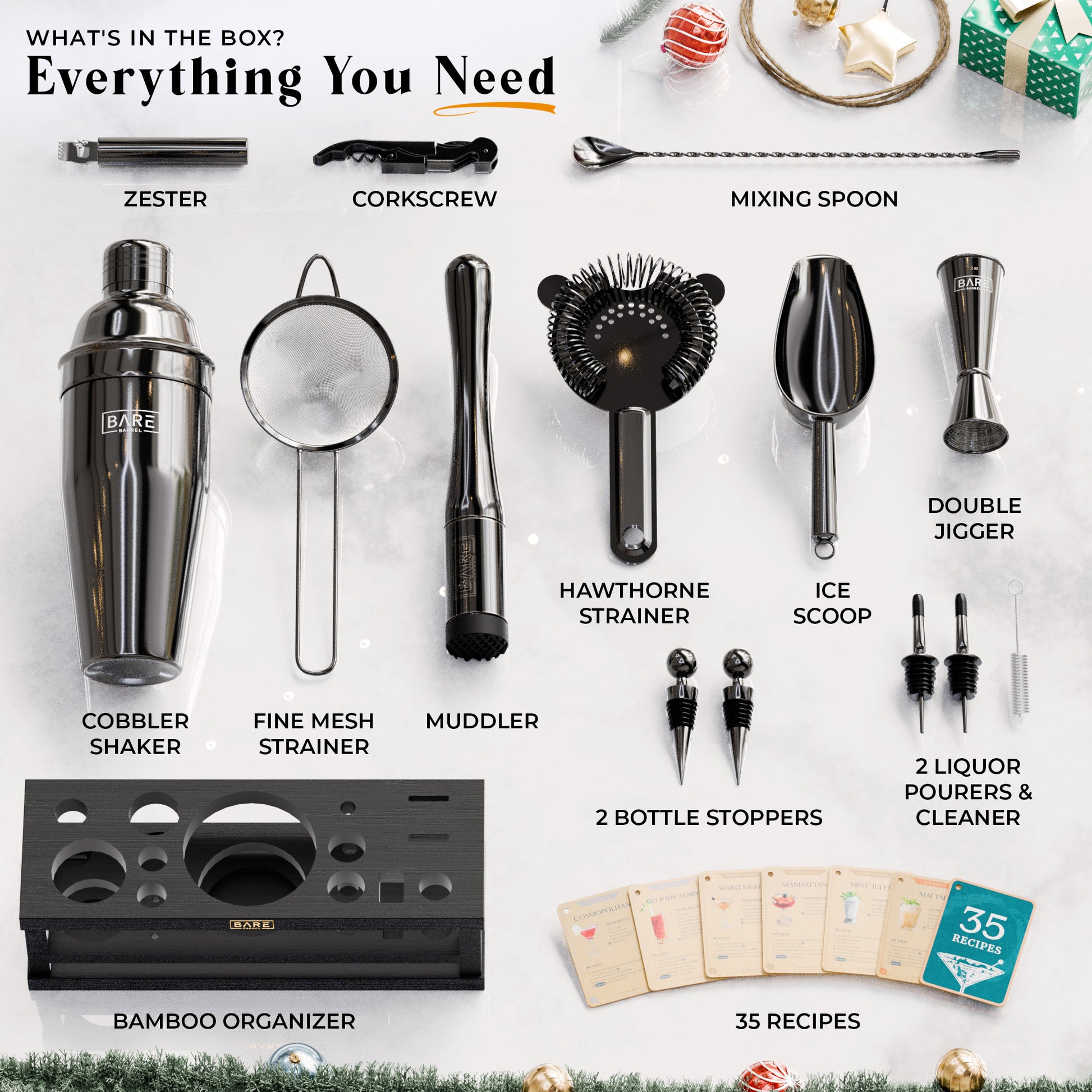 A complete bartending kit cocktail set with all the bar cart essentials equipment you need to shake & mix up delicious adult alcoholic drinks & mocktails.