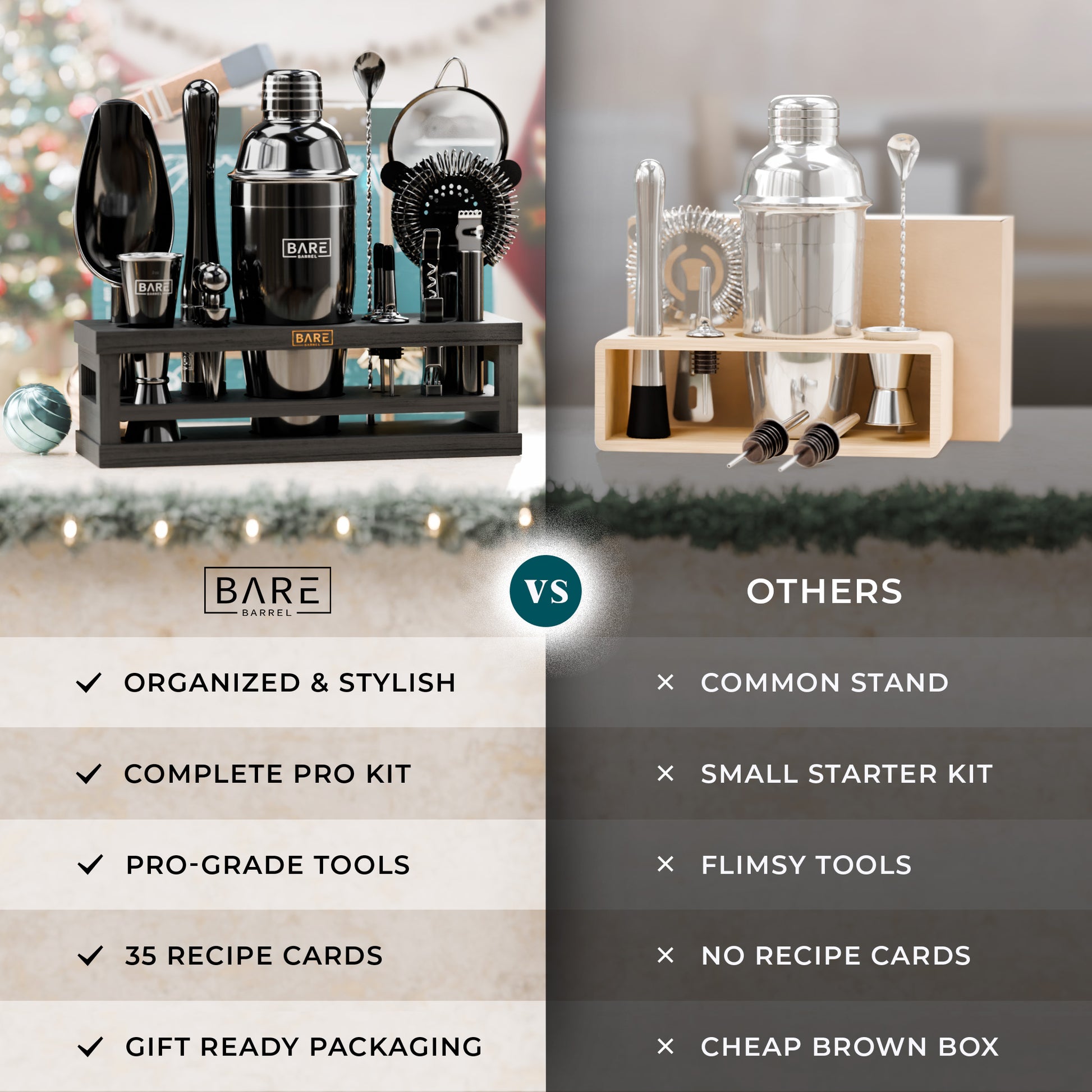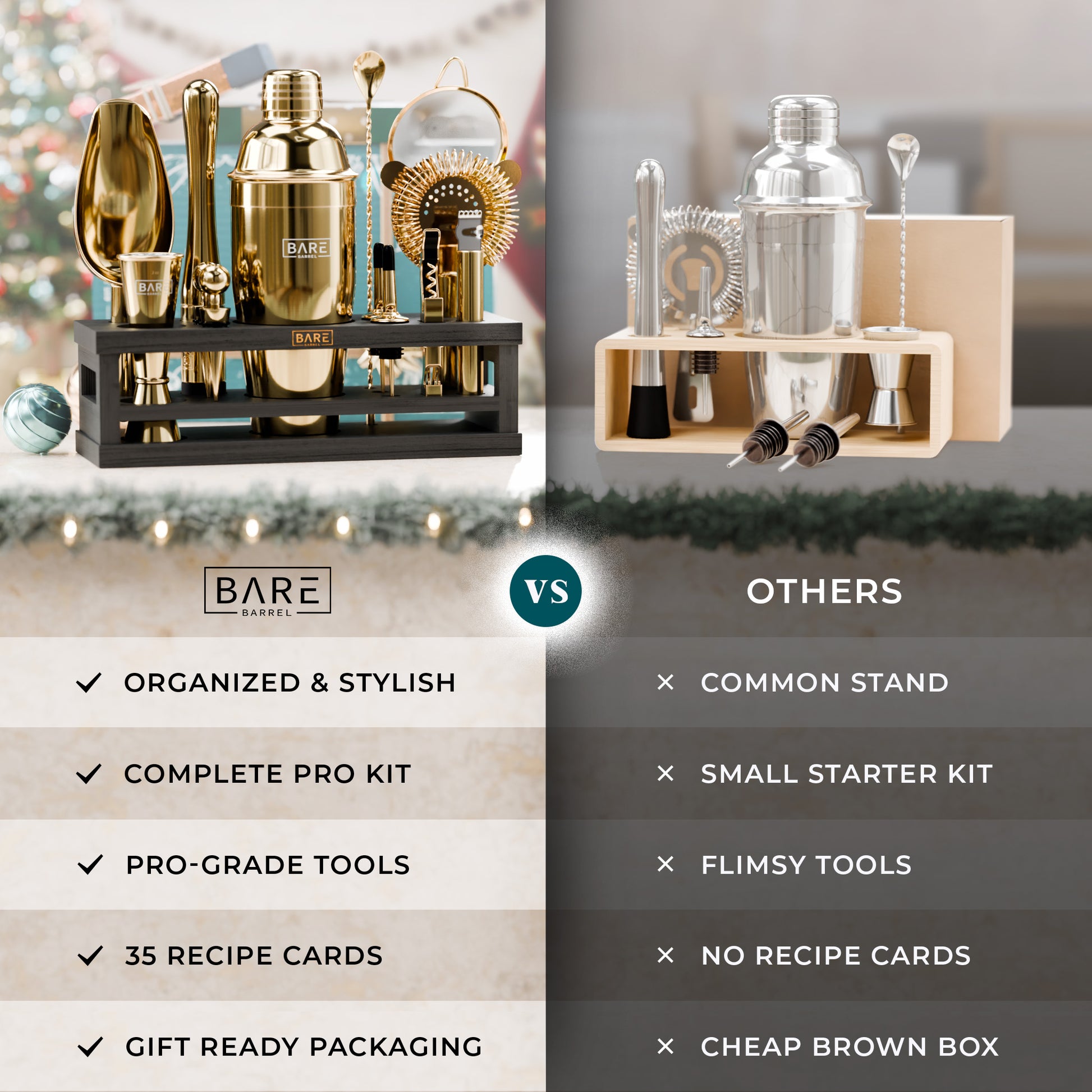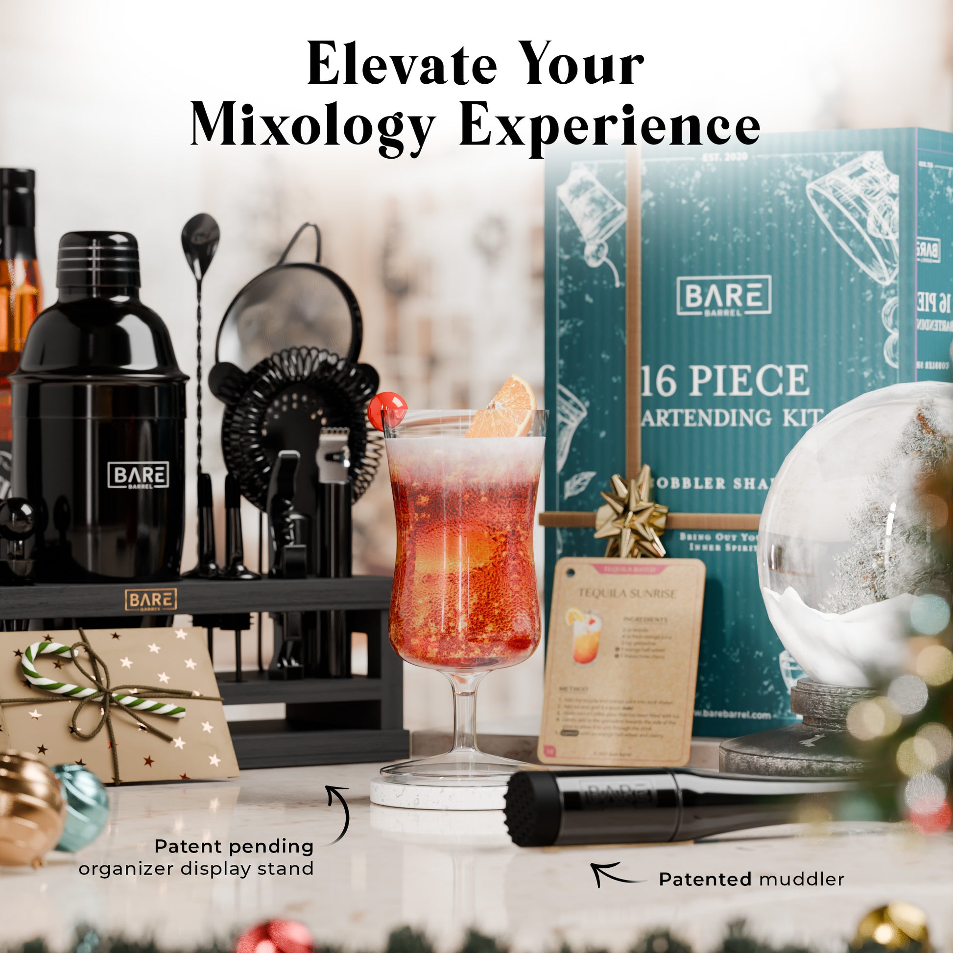 A complete bartending kit cocktail set with all the bar cart essentials equipment you need to shake & mix up delicious adult alcoholic drinks & mocktails.