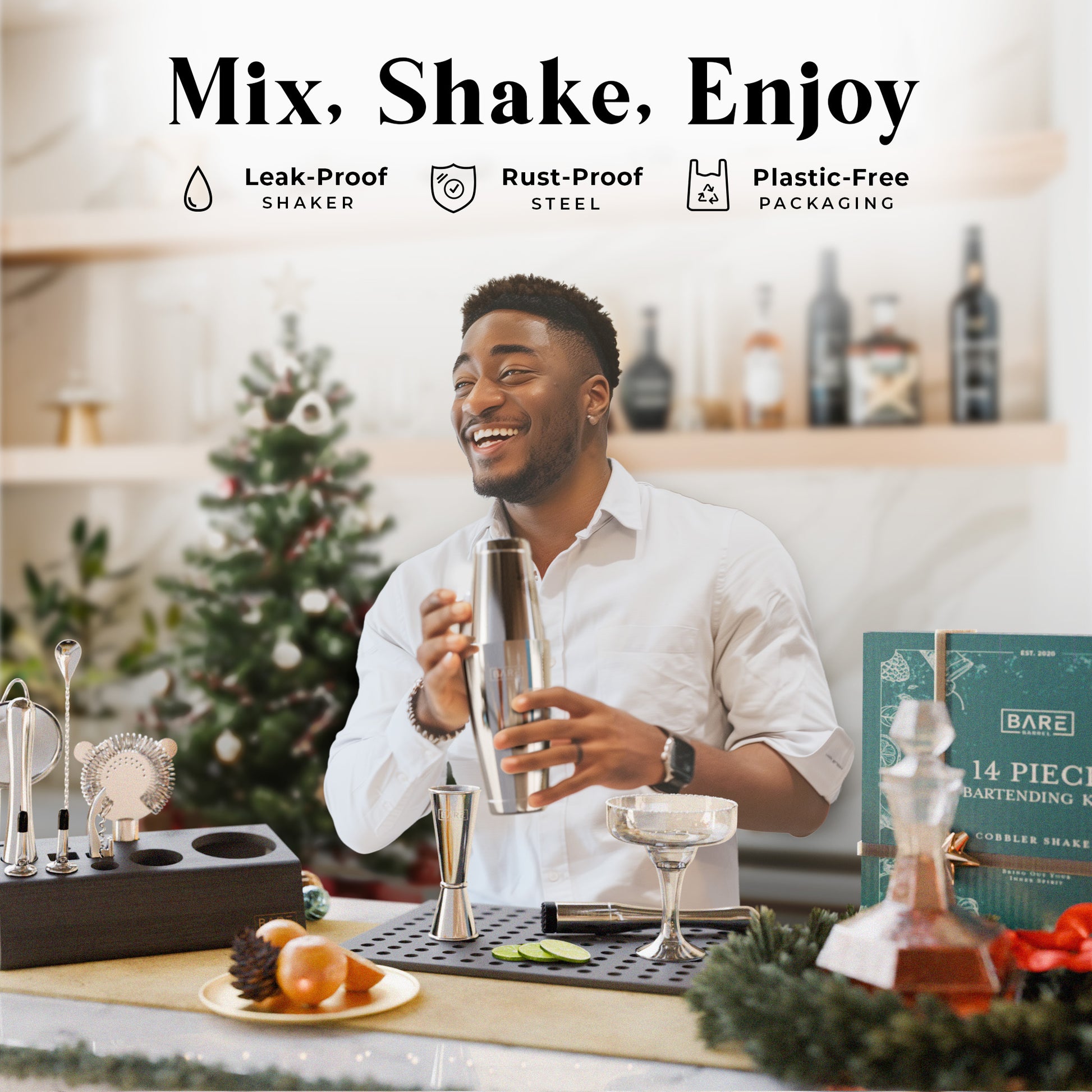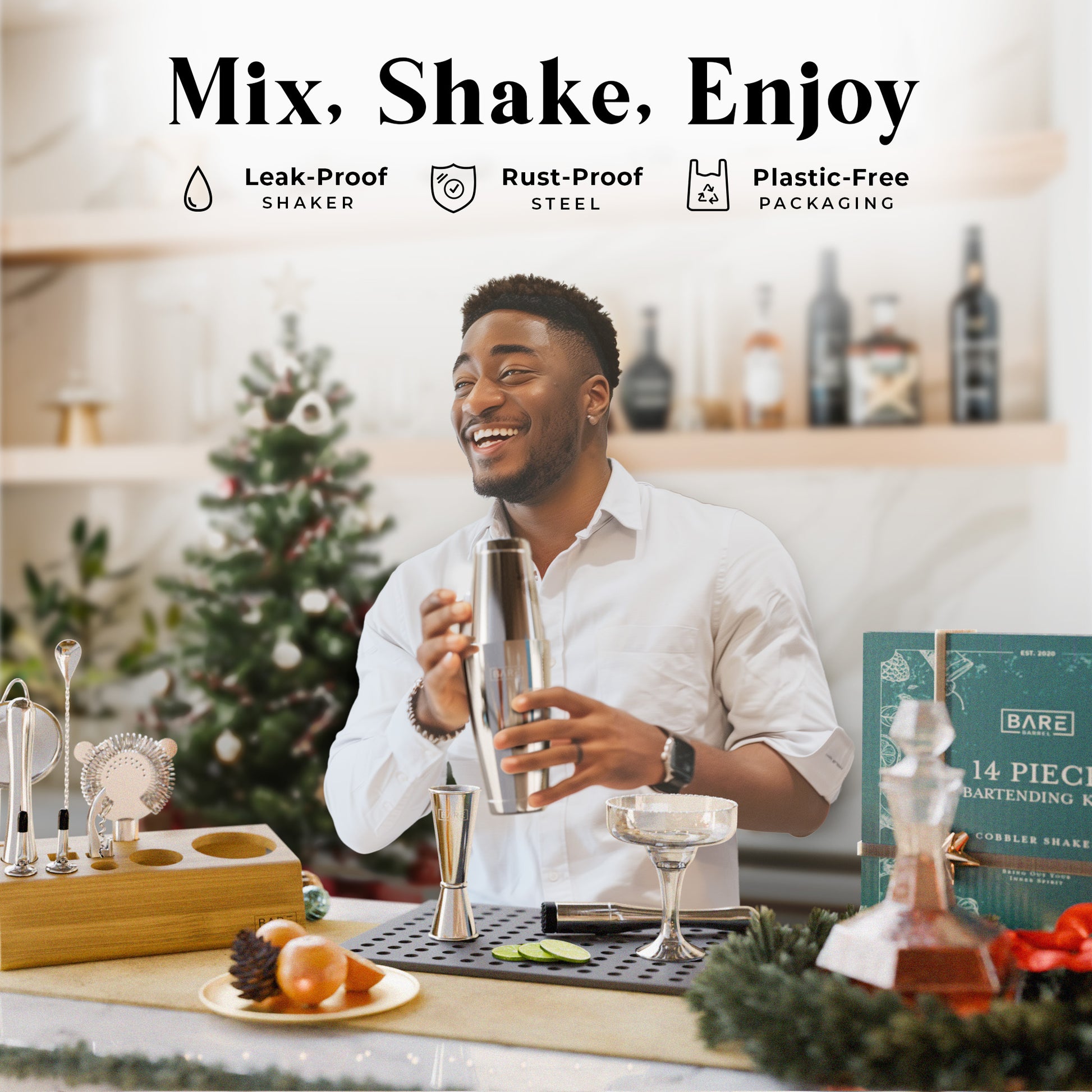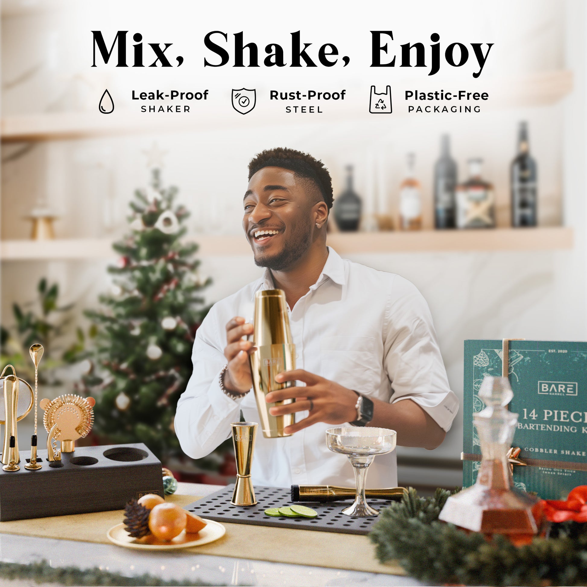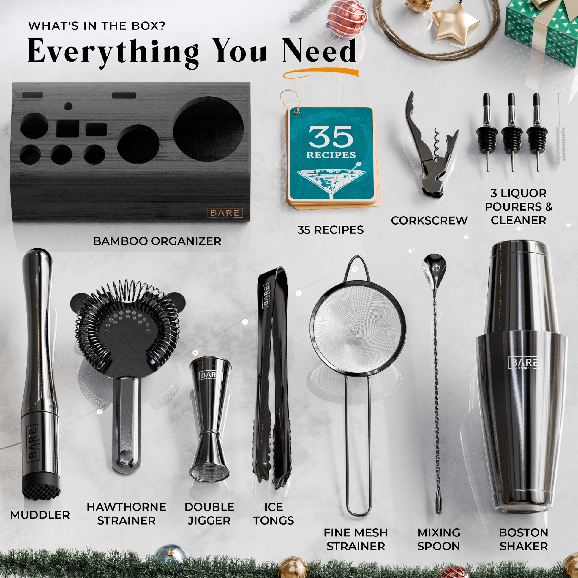 A complete bartending kit cocktail set with all the bar cart essentials equipment you need to shake & mix up delicious adult alcoholic drinks & mocktails.