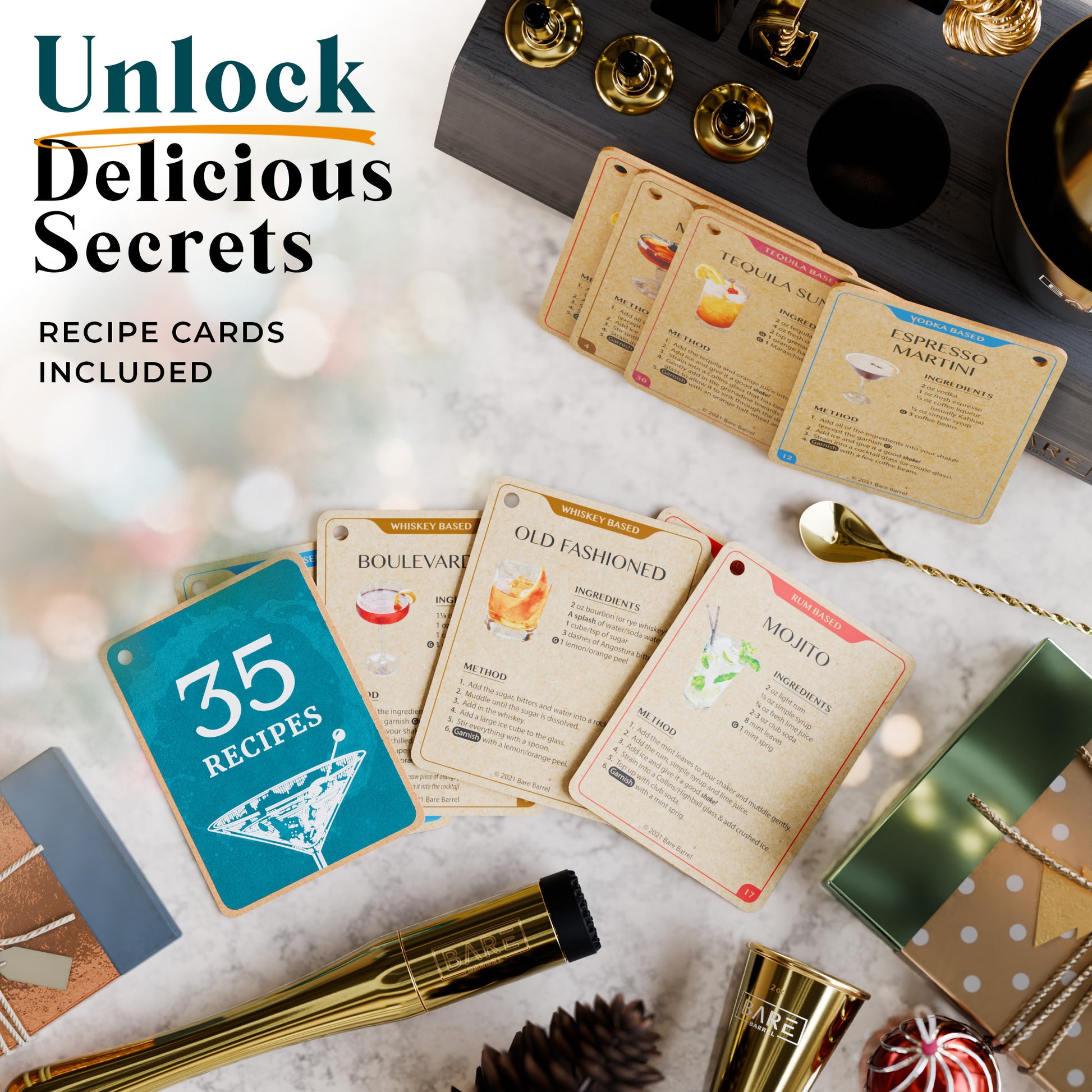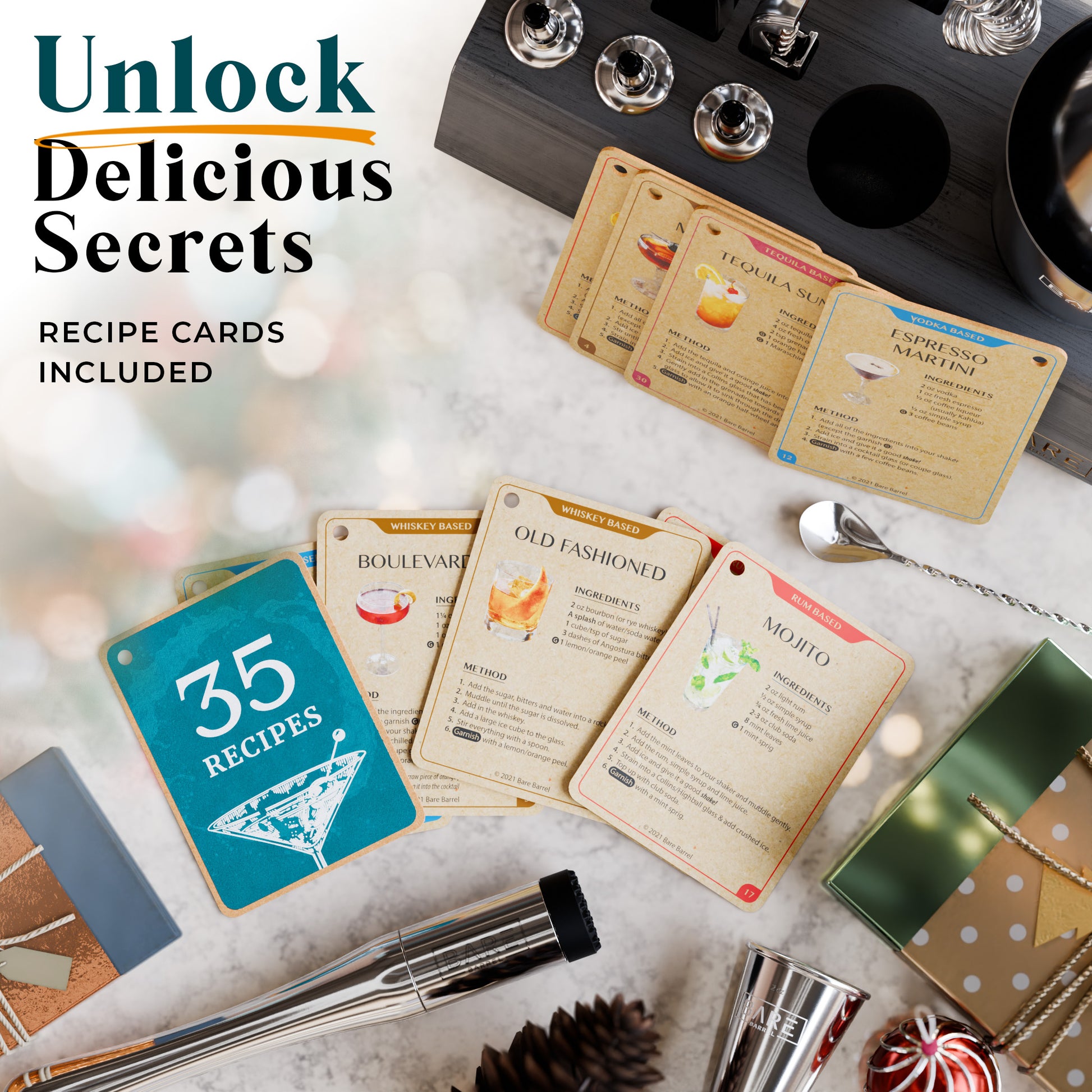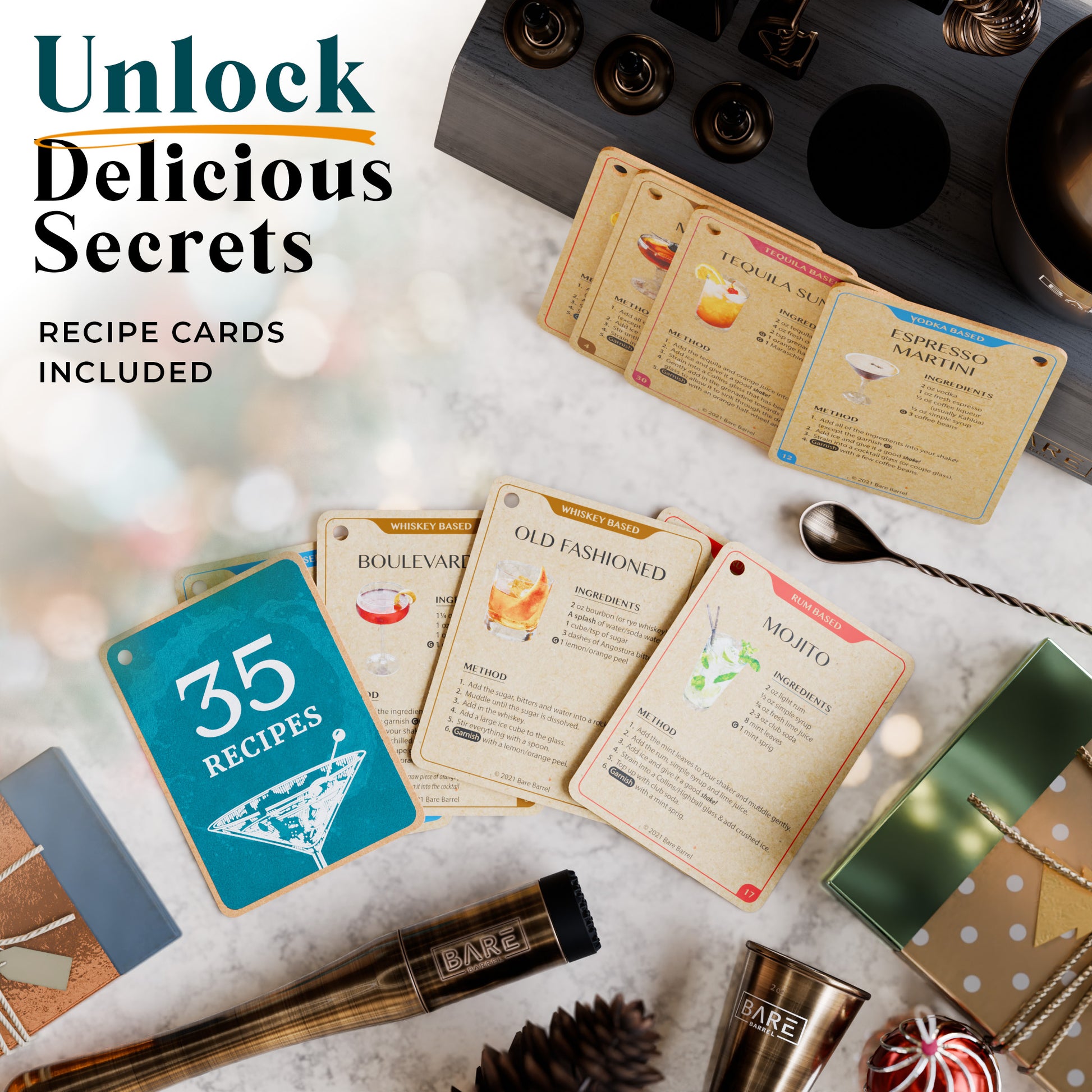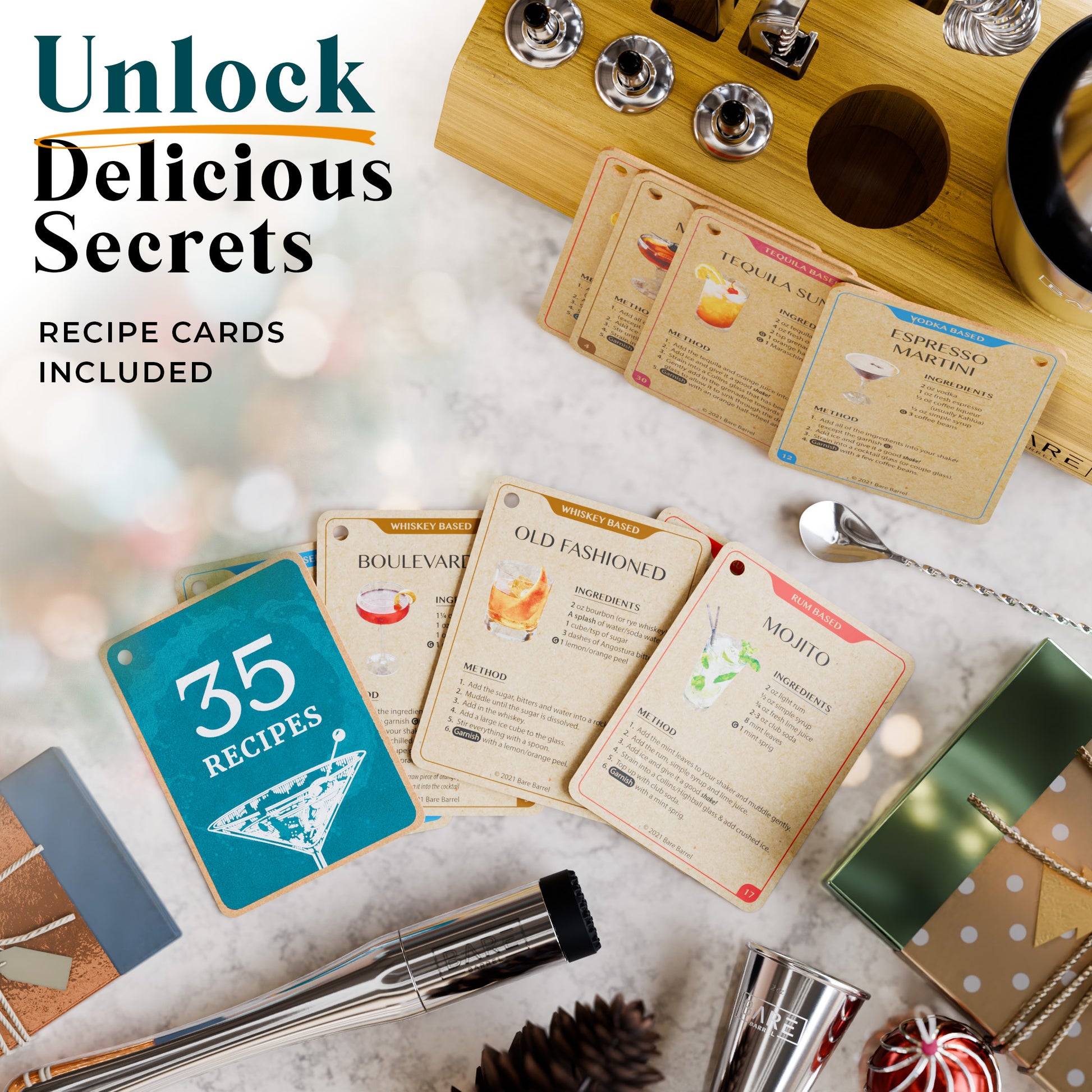 Includes 35 recipe cards, so whether you fancy the taste of whiskey, vodka, rum, gin or tequila, you're covered! Enjoy an Old Fashioned, Margarita, Martini, Mojito...