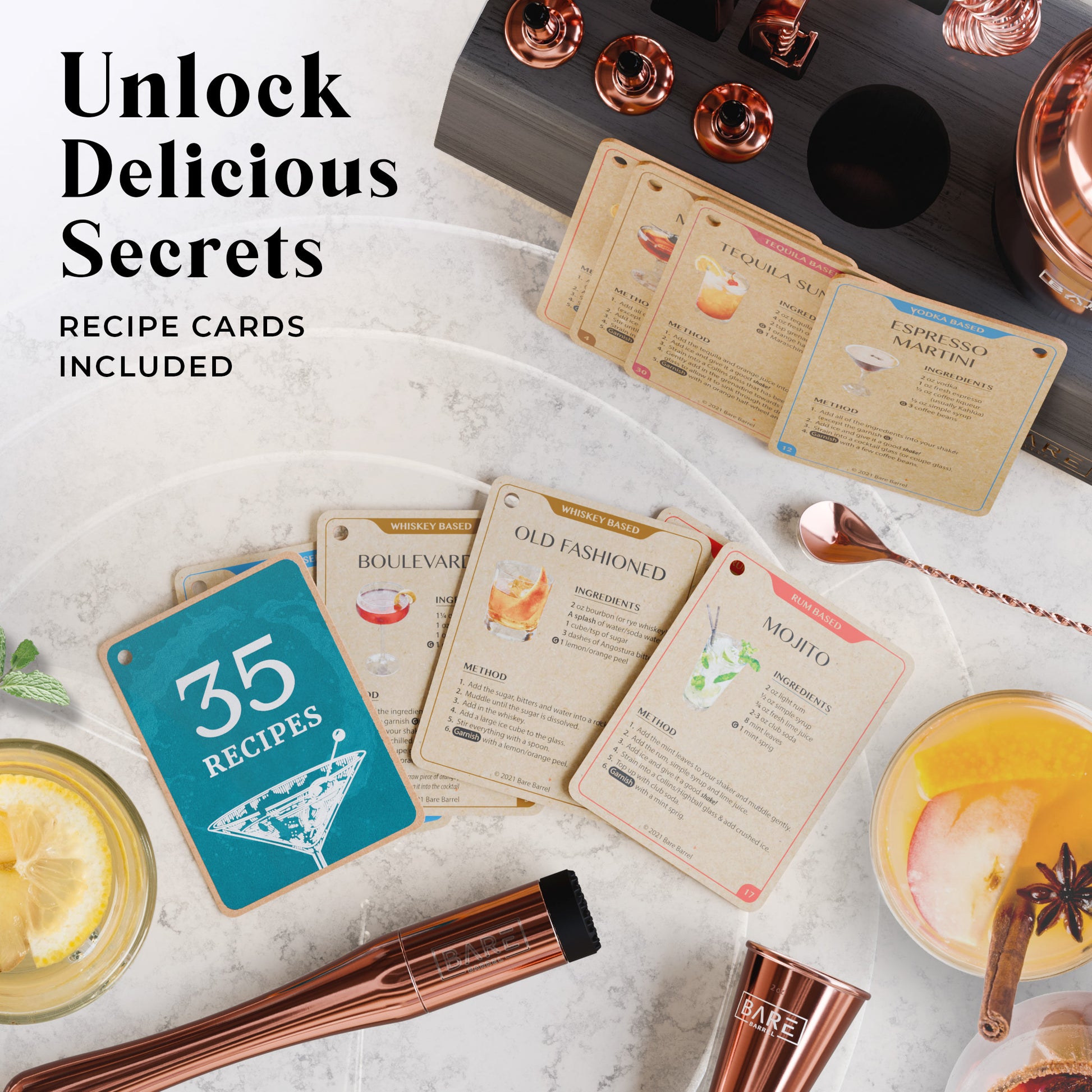 Thinking of a cool present for the aspiring mixologist in your life? With the design and functionality of our bartending kit, your friends and family would certainly enjoy using and showcasing your cocktail gift set. - 35 RECIPE CARDS FOR A FUN MIXING EXPERIENCE