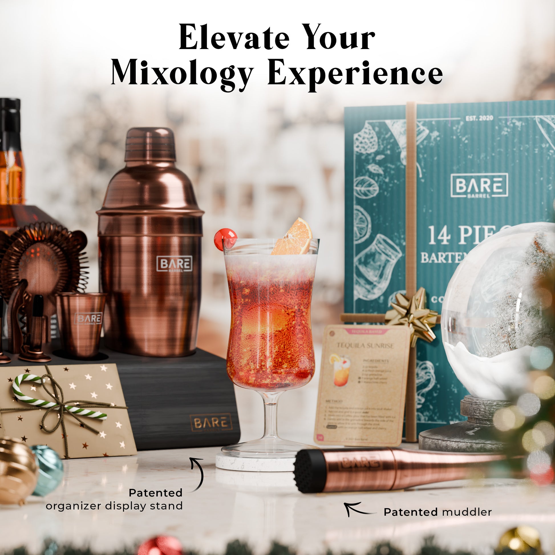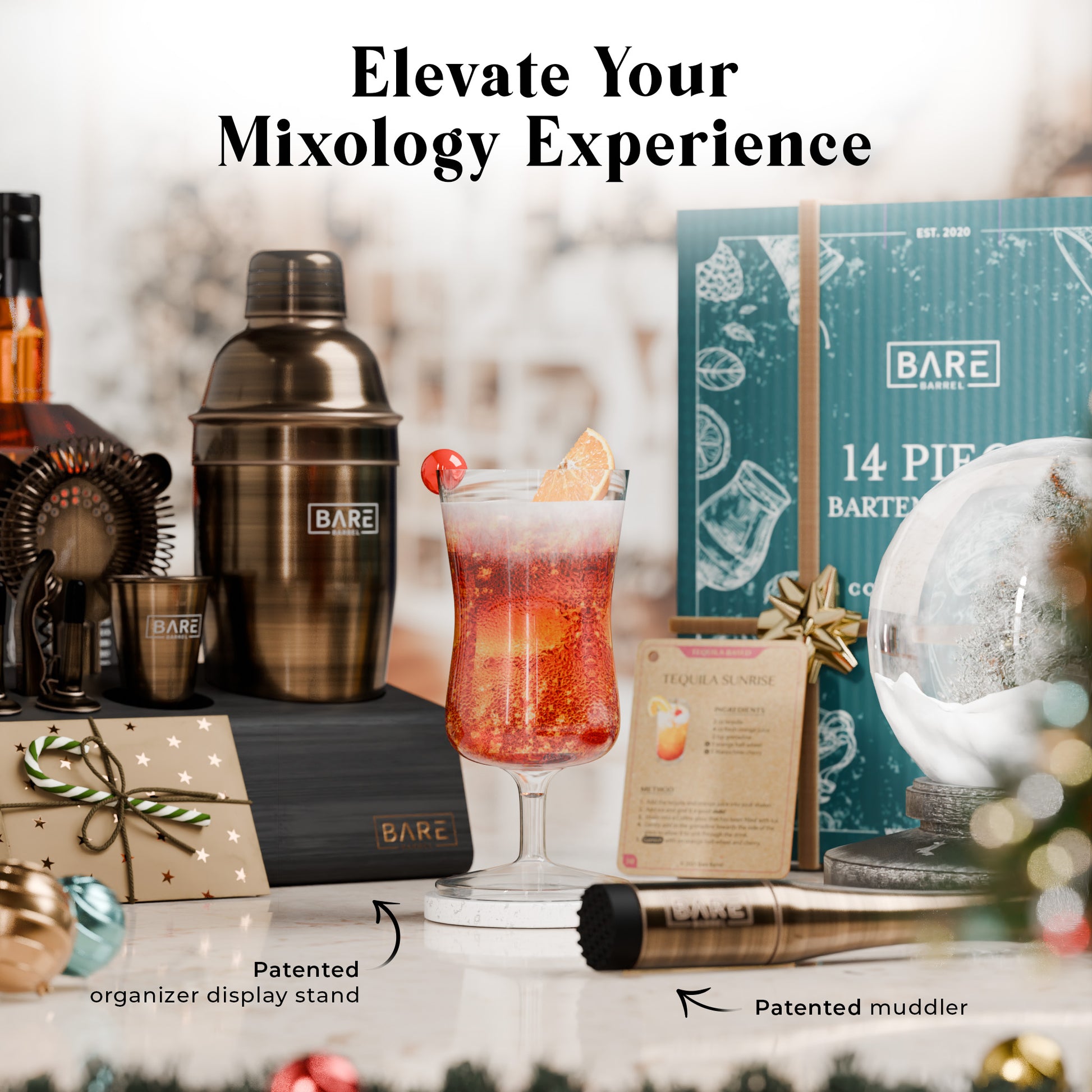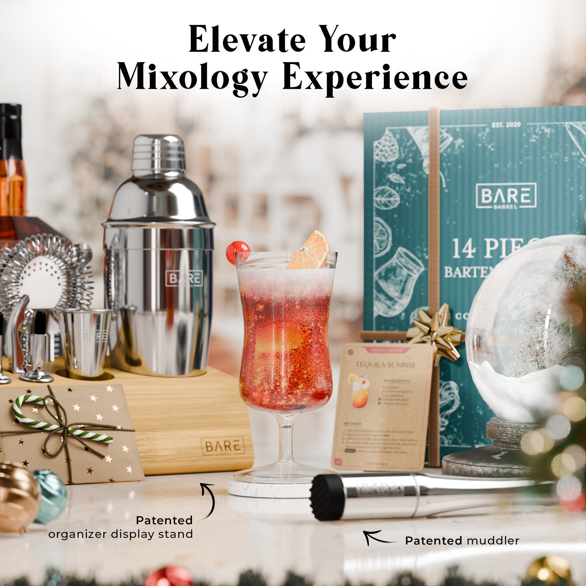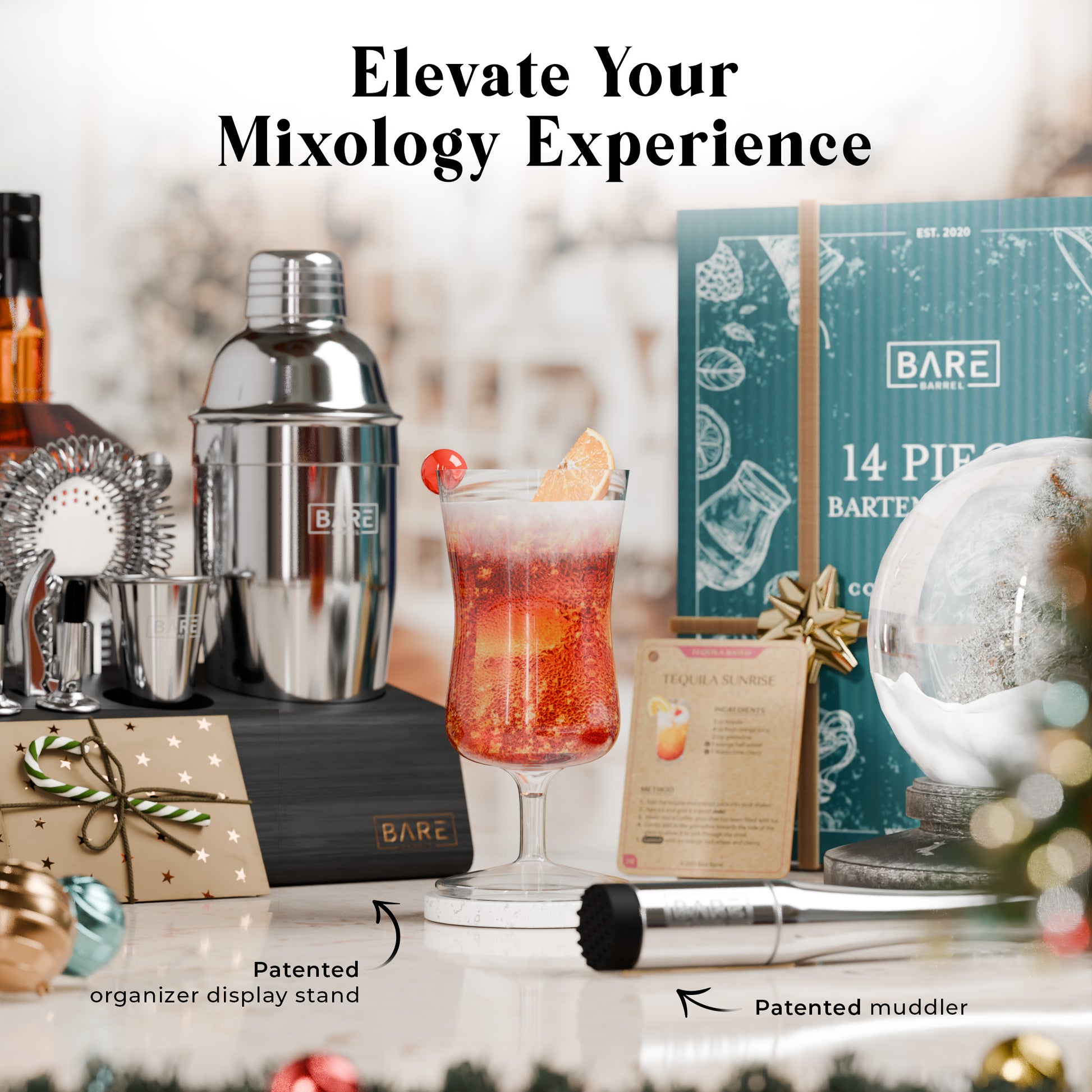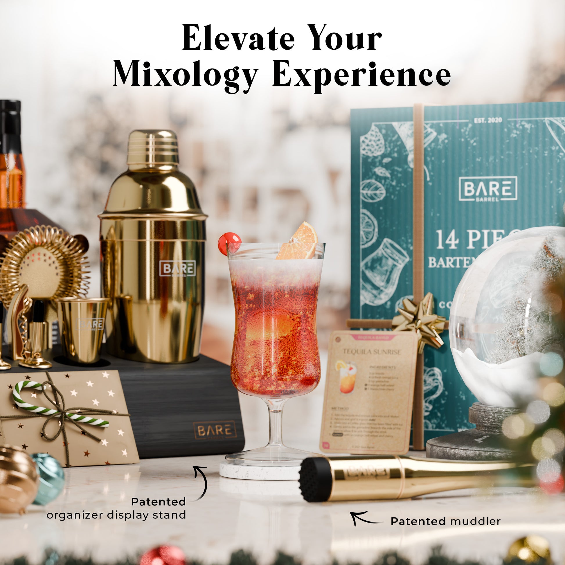 A complete bartending kit cocktail set with all the bar cart essentials equipment you need to shake & mix up delicious adult alcoholic drinks & mocktails.
