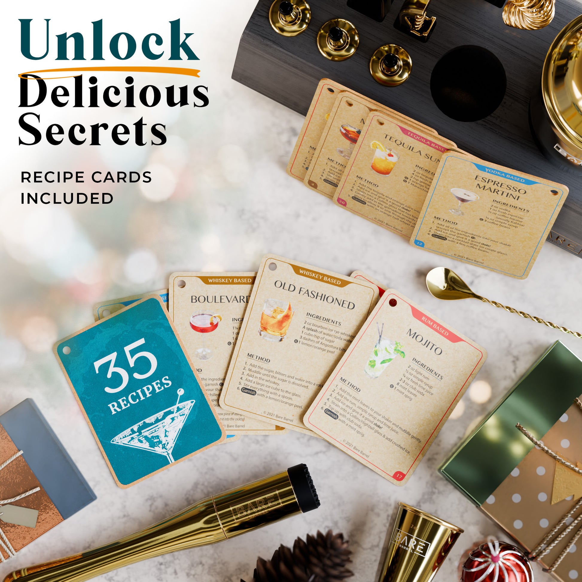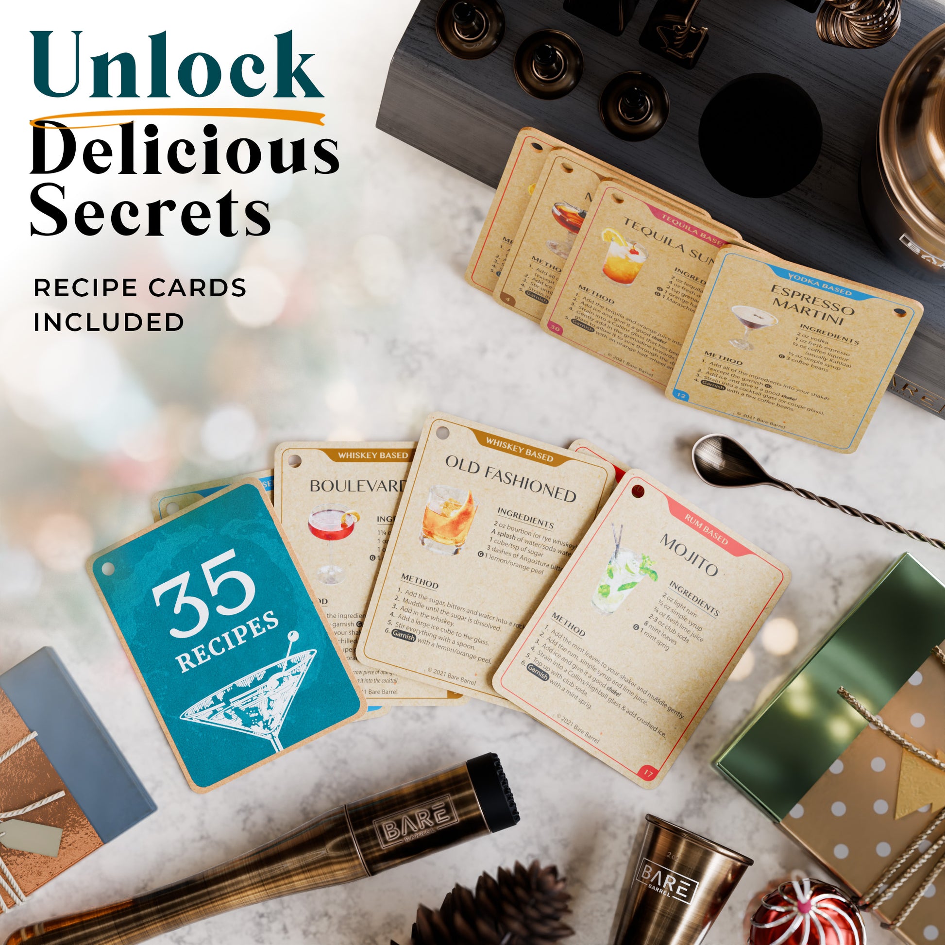 Includes 35 recipe cards, so whether you fancy the taste of whiskey, vodka, rum, gin or tequila, you're covered! Enjoy an Old Fashioned, Margarita, Martini, Mojito...